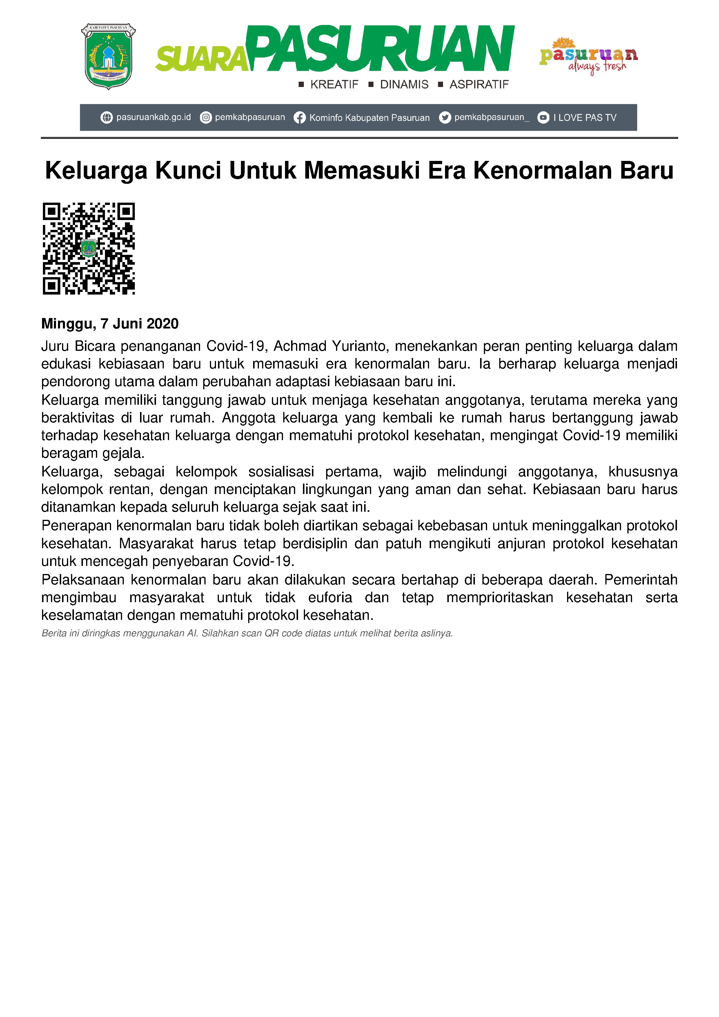 Keluarga memiliki peran penting untuk memberikan edukasi kepada anggota keluarganya mengenai kebiasaan baru dalam menghadapi persiapan penerapan kenormalan baru/ new normal. Hal tersebut disampaikan Juru bicara penanganan Covid-19, Achmad Yurianto menyikapi rencana Pemerintah yang akan mulai mengimplementasikan kebiasaan hidup yang baru sebagai upaya agar masyarakat dapat kembali produktif namun tetap aman dari Covid-19.