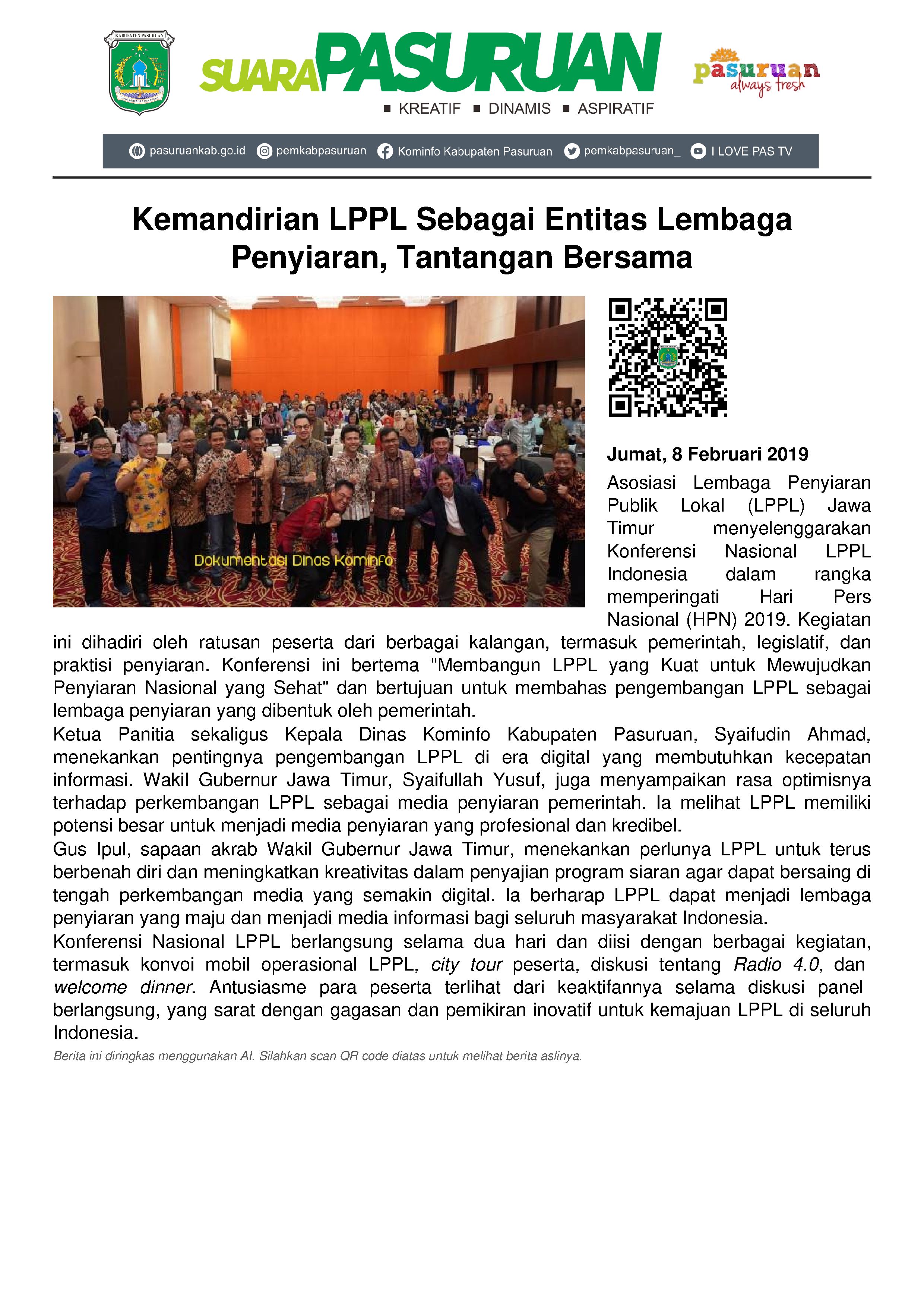 Memperingati Hari Pers Nasional (HPN) 2019, Asosiasi Lembaga Penyiaran Publik Lokal (LPPL) Jawa Timur menyelenggarakan Konferensi Nasional LPPL Indonesia. Bertempat di Ballrom Hotel Santika Premier, Surabaya, Kamis (07/02/2019), kegiatan bertema “Membangun LPPL yang Kuat untuk Mewujudkan Penyiaran Nasional yang Sehat” tersebut dihadiri oleh ratusan peserta yang terdiri dari berbagai kalangan, baik pemerintahan, legislatif maupun praktisi penyiaran. Diantaranya, Dirjen PPI Kemenkominfo RI, Ramli; Wakil Ketua Komisi I DPR RI, Satya Widya Yudha; Ketua Dewan Pengawas LPP RRI, Mistam Abz; Ketua Komisi Penyiaran Indonesia (KPI) Pusat, Yuliandre Darwis, Ketua KPID Provinsi Jawa Timur, Afif Amrullah dan seluruh Dinas Kominfo Provinsi/ Kabupaten/ Kota seluruh Indonesia.