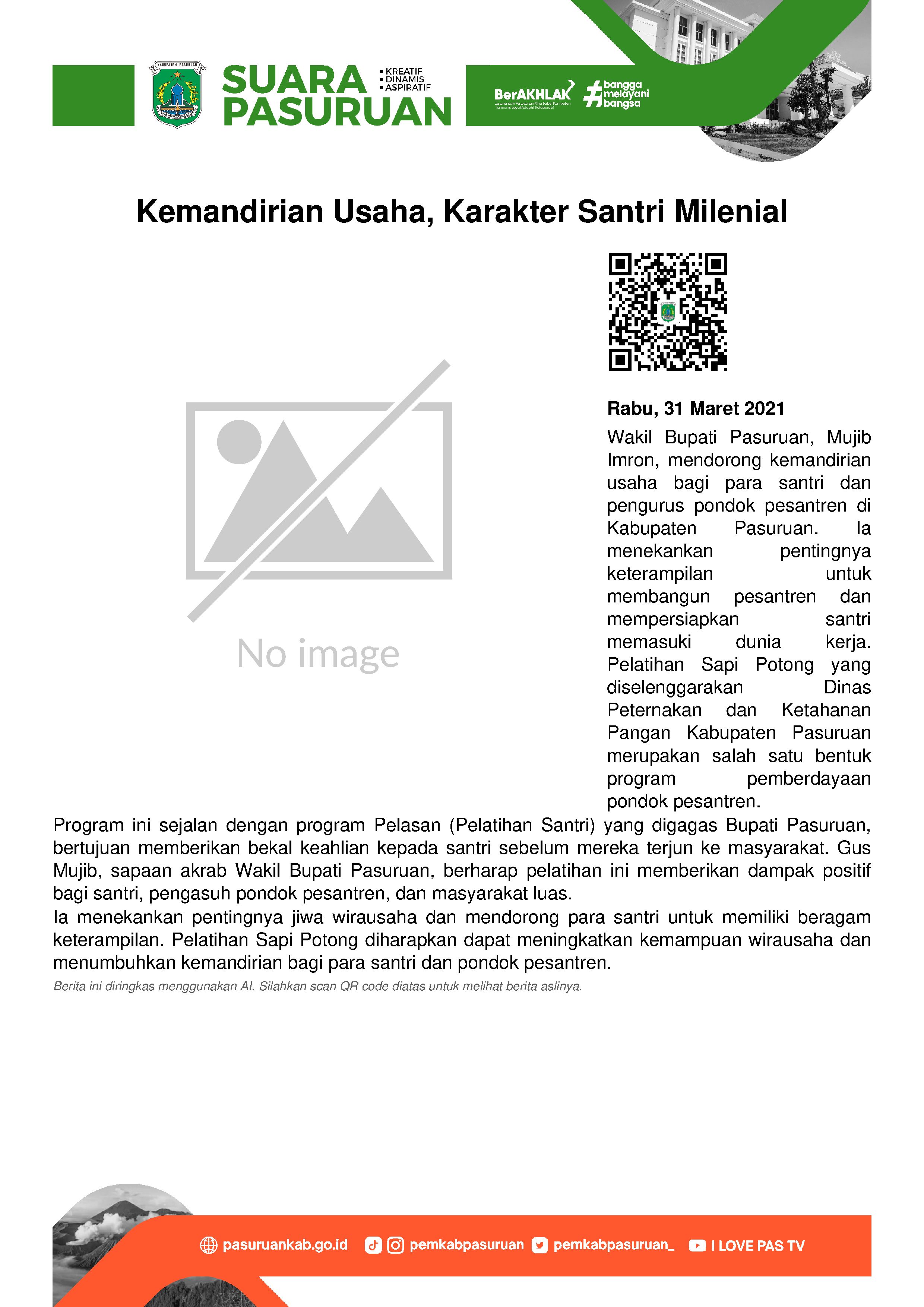 Wakil Bupati Pasuruan, Mujib Imron mengajak seluruh santri dan pengurus pondok pesantren di Kabupaten Pasuruan agar mempunyai usaha mandiri. Selain bertujuan untuk mengembangkan pesantren, ketrampilan tersebut sekaligus menjadi bekal untuk berdikari. Pernyataan tersebut disampaikan oleh Mujib Imron dalam Pelatihan Sapi Potong yang dilaksanakan oleh Dinas Peternakan dan Ketahanan Pangan Kabupaten Pasuruan.