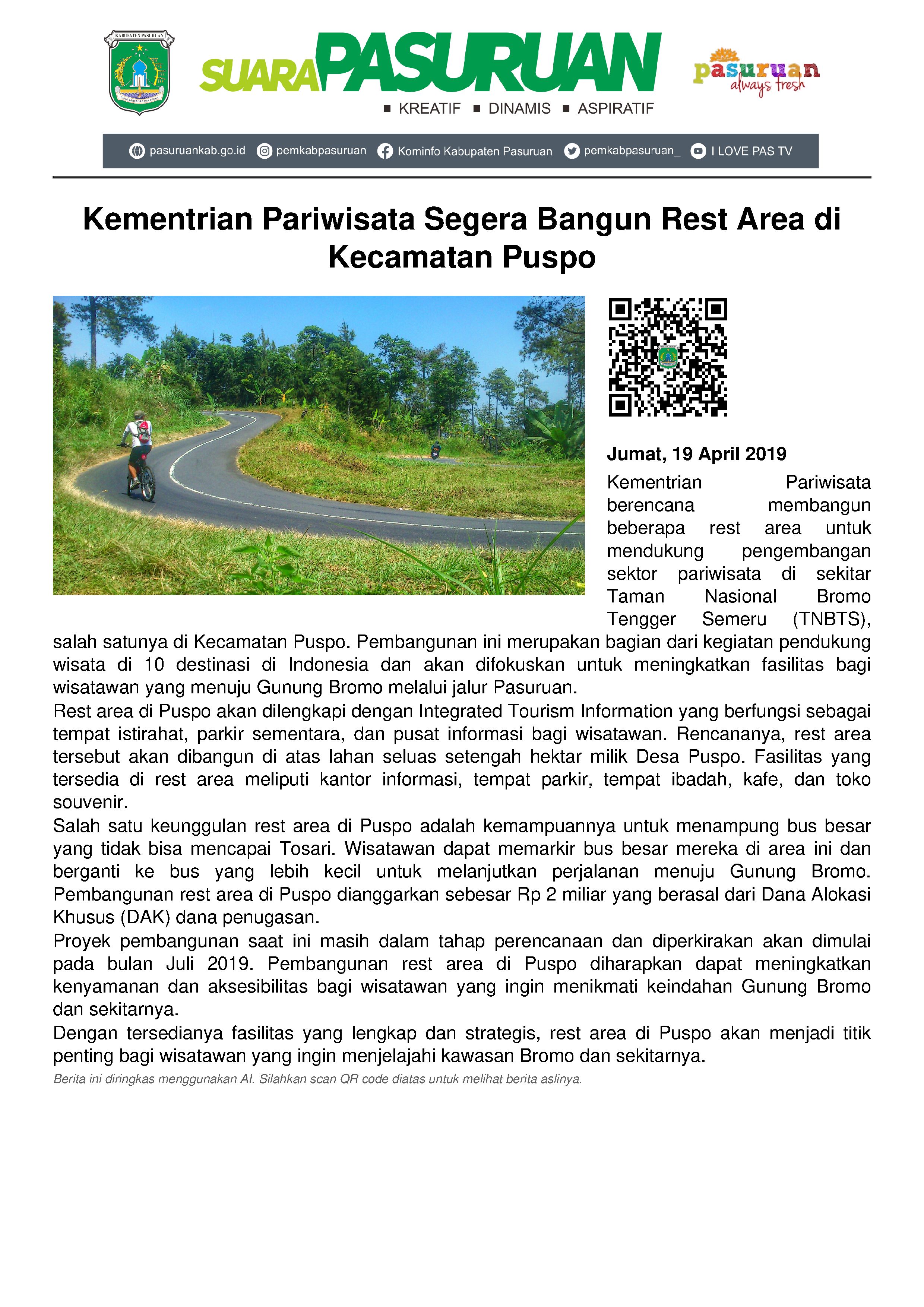 Budi Shoreanto, Kabid Industri Pariwisata pada Dinas Pariwisata dan Kebudayaan (Disparbud) Kabupaten Pasuruan mengatakan, pembangunan rest area di Puspo adalah satu dari kegiatan pendukung wisata di 10 destinasi di tanah air. Dimana bakal dibangun rest area pendukung fasilitas wisatawan yang mau ke arah Bromo lewat Pasuruan