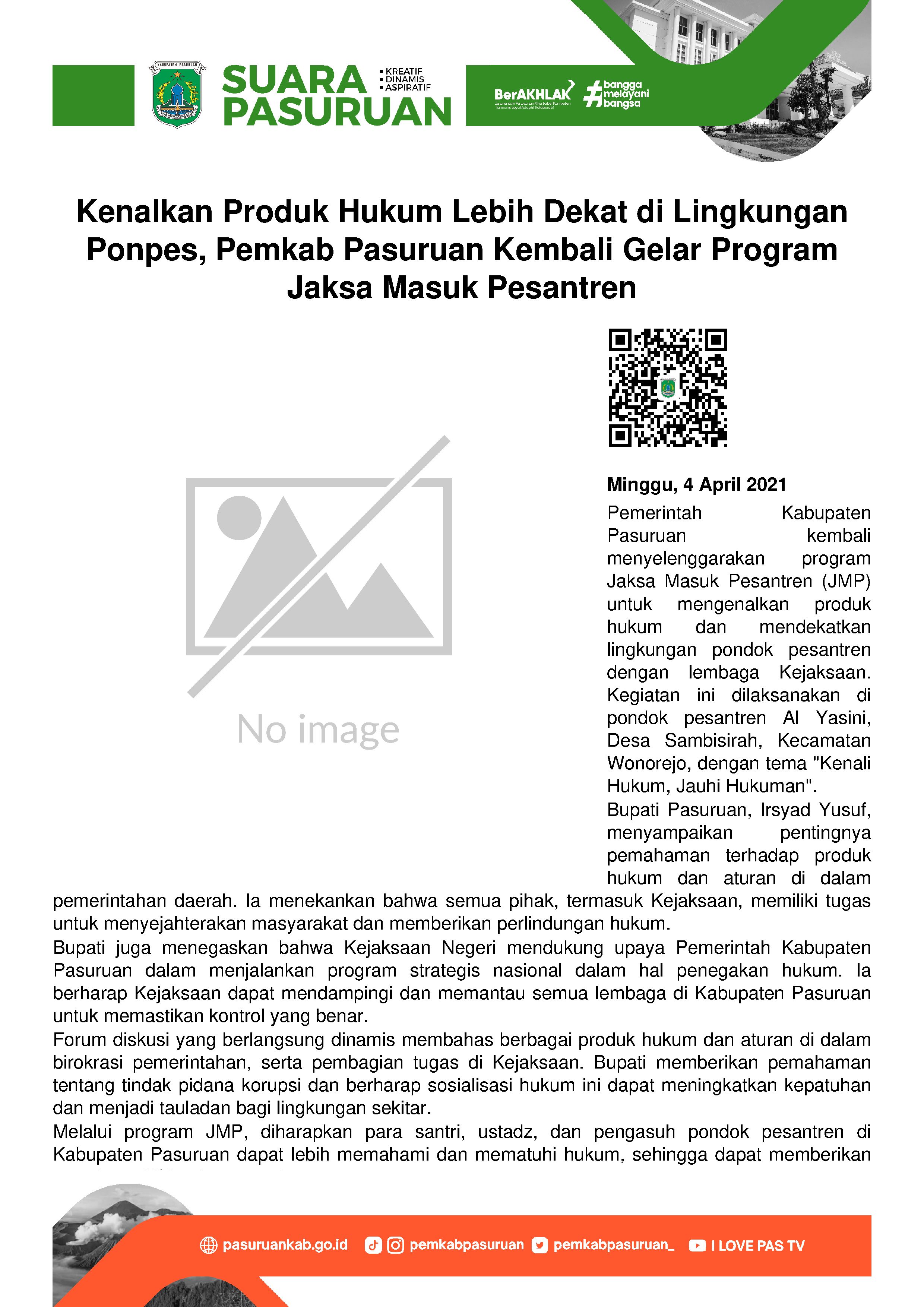Untuk mengenalkan produk hukum sekaligus lebih mendekatkan lingkungan pondok pesantren dengan lembaga Kejaksaan beserta tupoksinya, Pemerintah Kabupaten Pasuruan kembali menyelenggarakan program Jaksa Masuk Pesantren (JMP). Seperti yang dilaksanakan pada hari Kamis (1/4/2021) di pondok pesantren Al Yasini, Desa Sambisirah, Kecamatan Wonorejo.