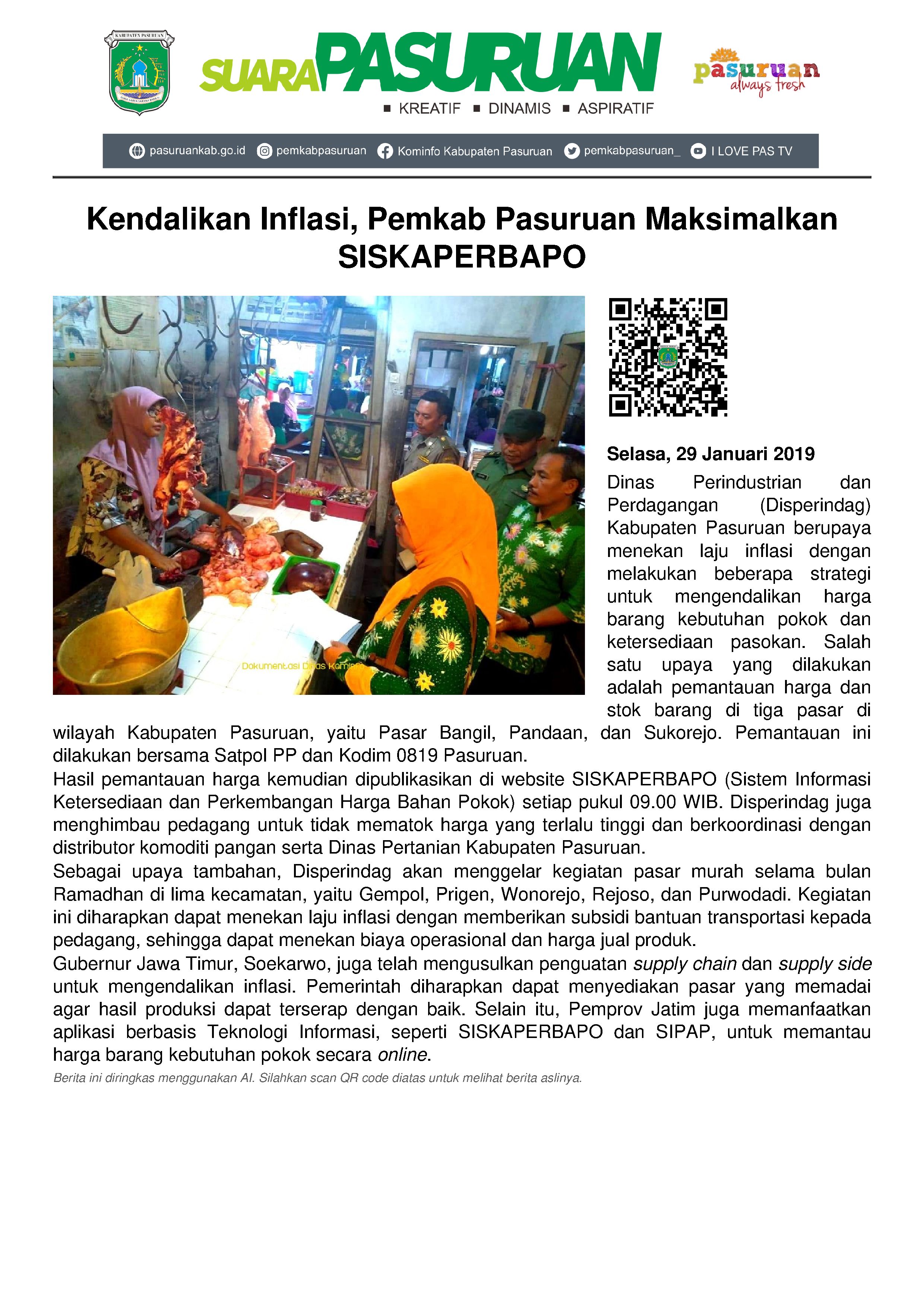 Untuk menekan laju inflasi di Kabupaten Pasuruan, Dinas Perindustrian dan Perdagangan (Disperindag) Kabupaten Pasuruan intens melakukan beberapa strategi yang bertujuan untuk mengendalikan harga barang-barang kebutuhan pokok dan ketersediaan pasokannya. Terlebih di saat puncak musim hujan di awal tahun 2019 yang sangat berpotensi menyebabkan turunnya tingkat produktivitas hasil panen tanaman pangan, seperti Padi dan Jagung.