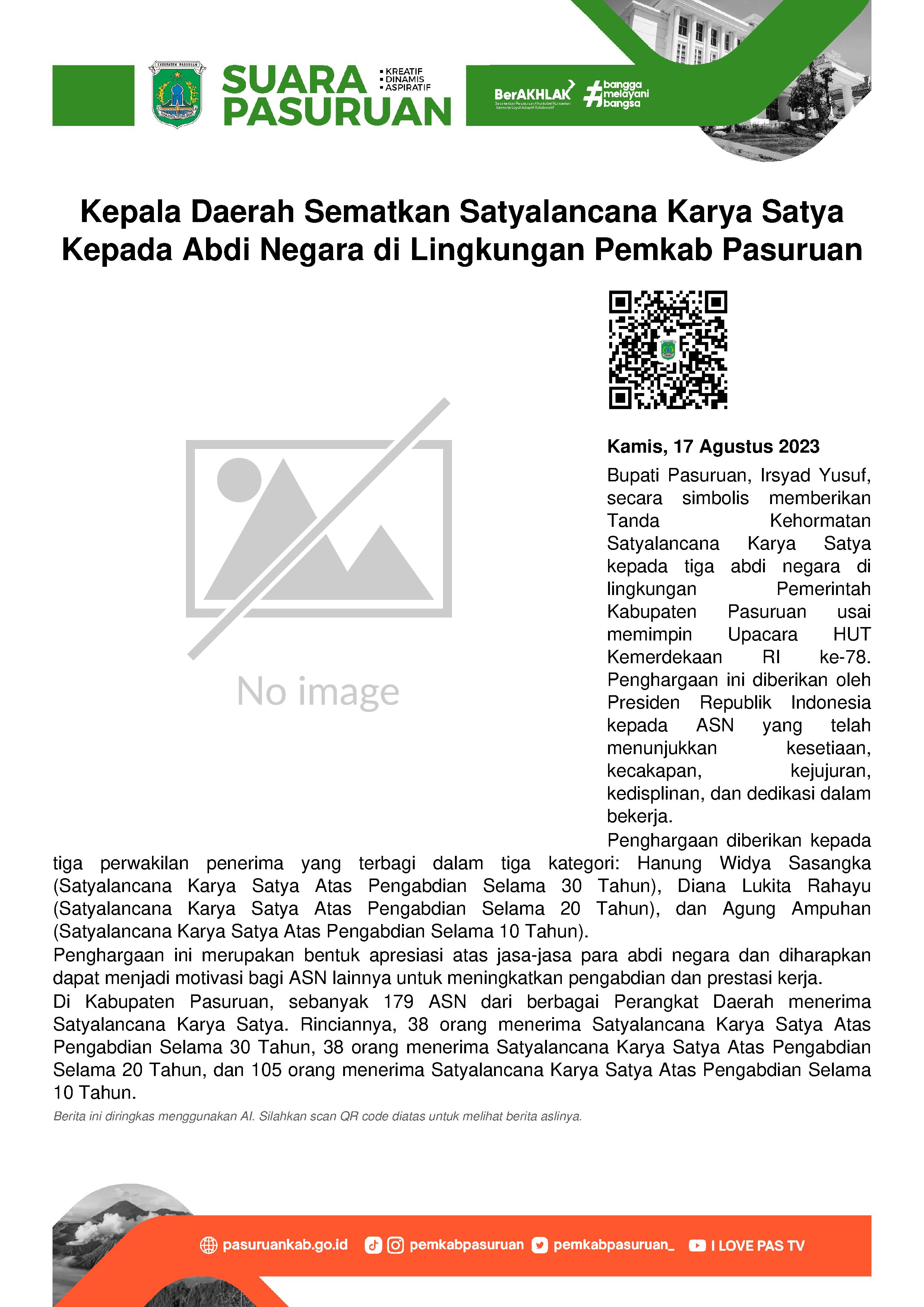Usai memimpin Upacara Hari Ulang Tahun (HUT) Kemerdekaan Republik Indonesia (RI) ke-78, Bupati Pasuruan, Irsyad Yusuf secara simbolis menyematkan Tanda Kehormatan Satyalancana Karya Satya kepada ke-3 abdi negara di lingkungan Pemerintah Kabupaten Pasuruan. Apresiasi diberikan oleh Presiden Republik Indonesia kepada Aparatur Sipil Negara (ASN) yang telah melaksanakan tugas dan pengabdiannya dengan menunjukkan kesetiaan, kecakapan, kejujuran, kedisplinan dan bekerja terus-menerus dalam jangka waktu tertentu.