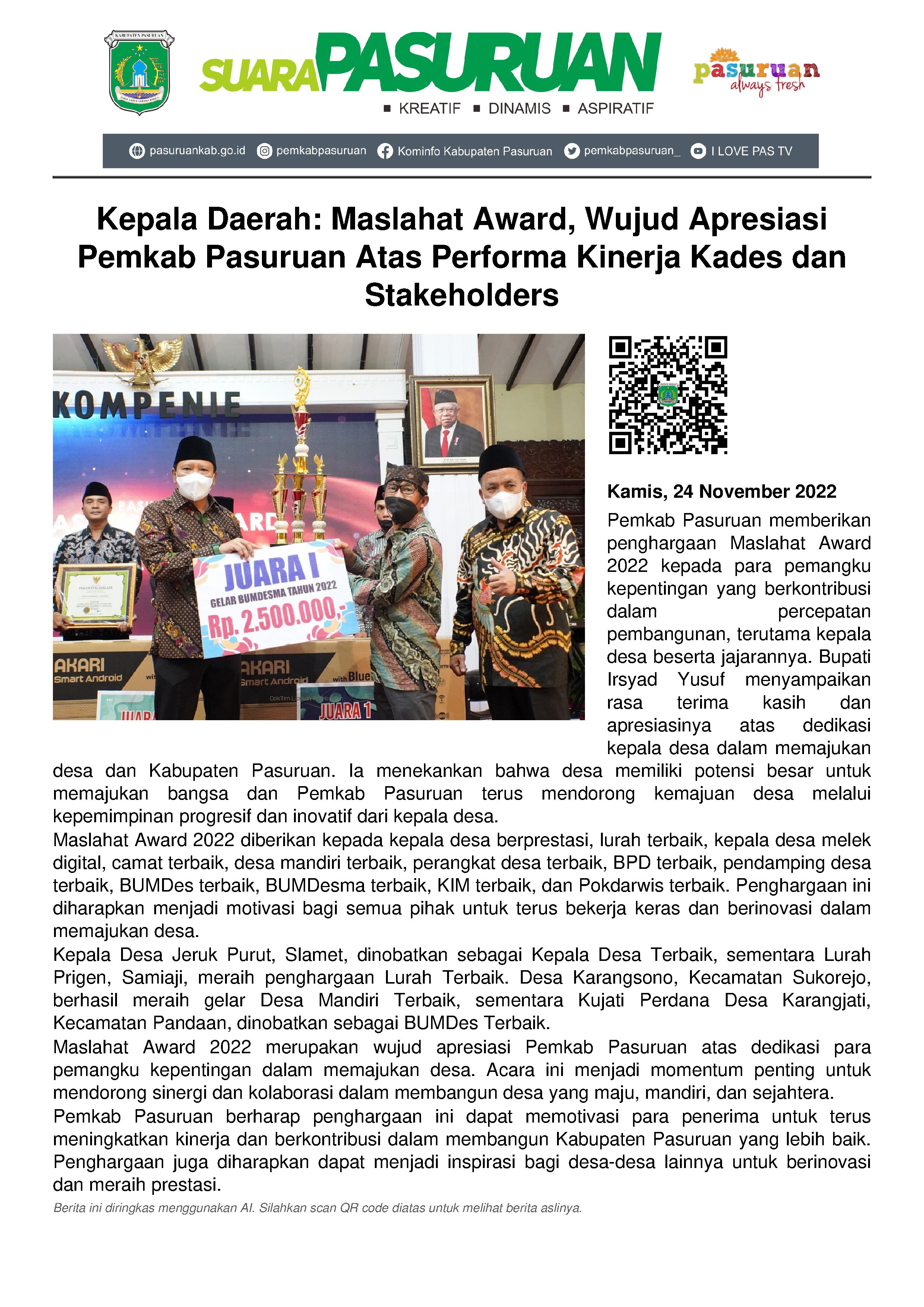 Bupati Irsyad Yusuf mengatakan, gelaran Maslahat Award 2022 merupakan bentuk apresiasi Pemerintah Kabupaten Pasuruan kepada para pemangku kepentingan/ stakeholders yang berkontribusi dalam upaya percepatan pembangunan. Diantaranya ditujukan bagi Kepala Desa beserta jajaran mitra kerjanya.