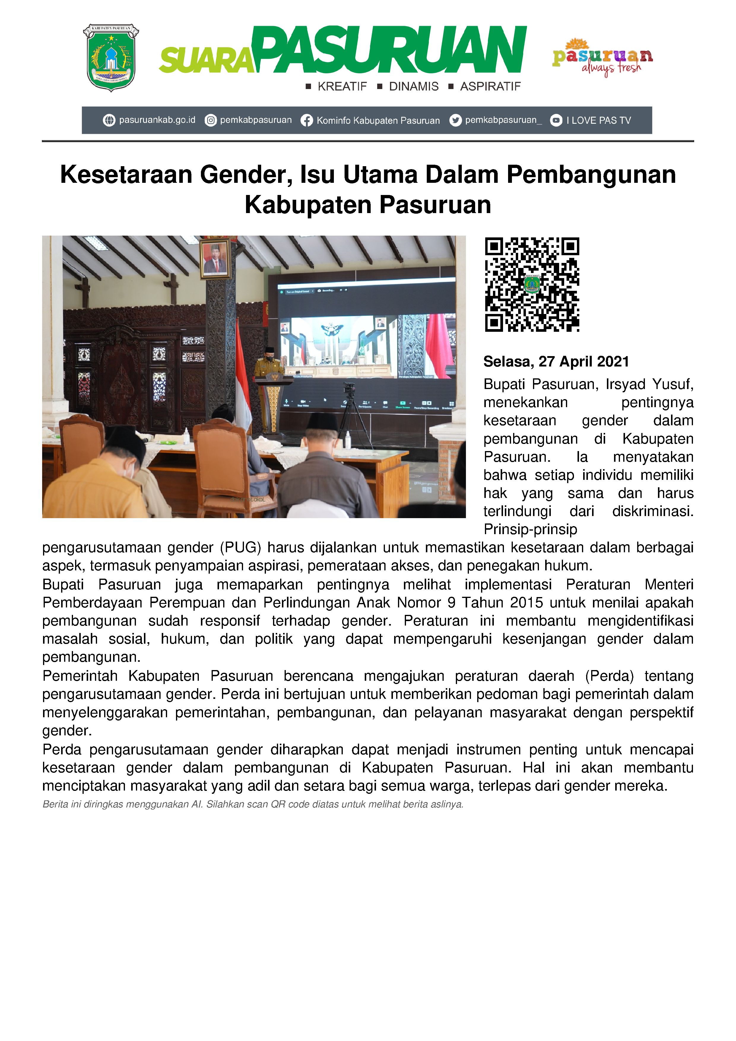Kesetaraan gender merupakan hal yang sangat penting dioptimalkan pelaksanaannya dalam pembangunan. Terlebih setiap individu memiliki hak perlindungan yang sama agar terhindar dari tindakan diskriminasi di masyarakat. Penjelasan itu disampaikan oleh Bupati Pasuruan, Irsyad Yusuf dalam Rapat Virtual Paripurna I DPRD Kabupaten Pasuruan terhadap Penyampaian Rancangan Peraturan Daerah Kabupaten Pasuruan tentang Pengarusutamaan Gender di Pendopo Nyawiji Ngesti Wenganing Gusti, Senin (26/4/2021).