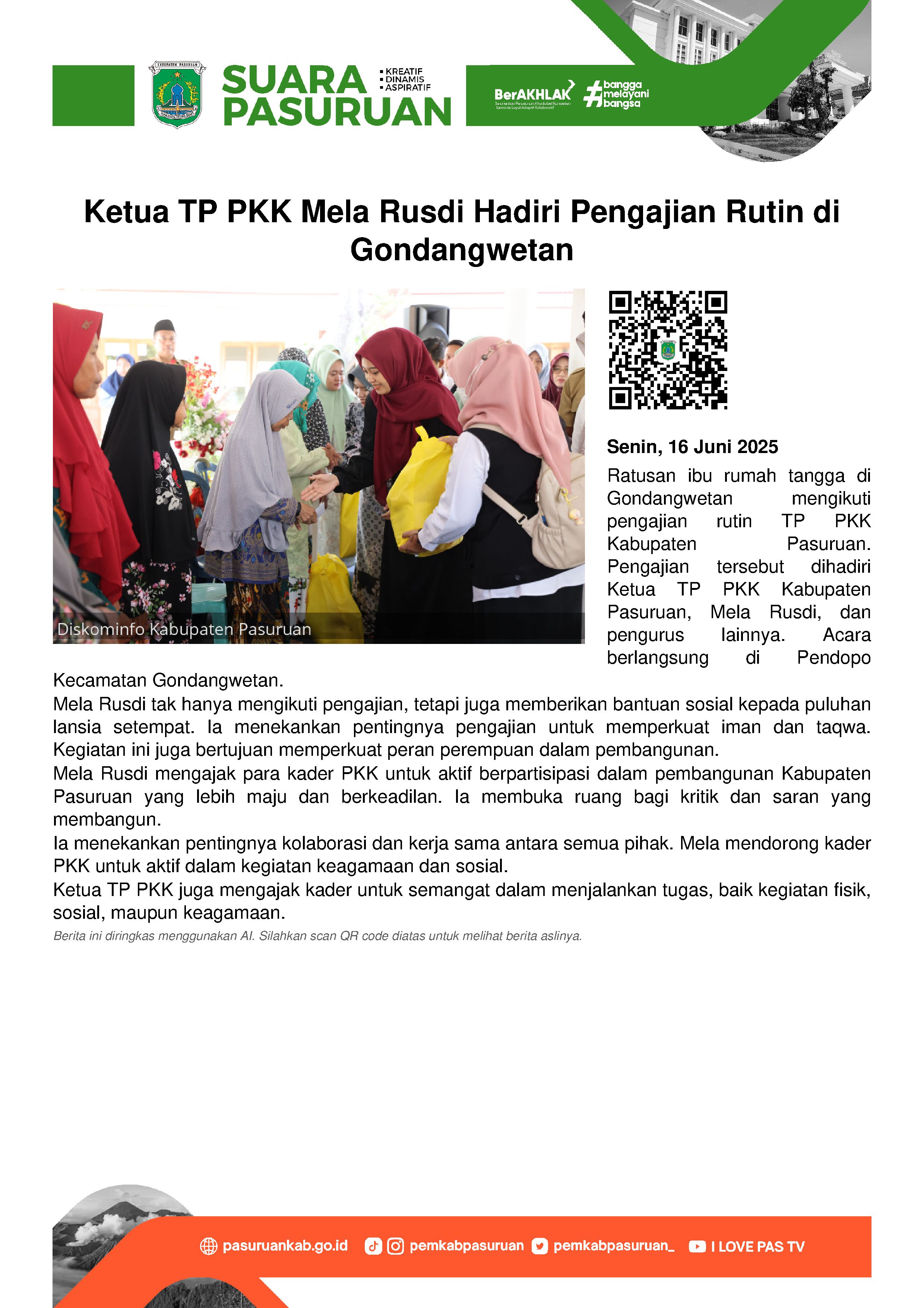 Ratusan ibu rumah tangga di wilayah Kecamatan Gondangwetan mengikuti Pengajian Rutin yang diselenggarakan Tim Penggerak PKK Kabupaten Pasuruan, Senin (16/6/2025) siang.