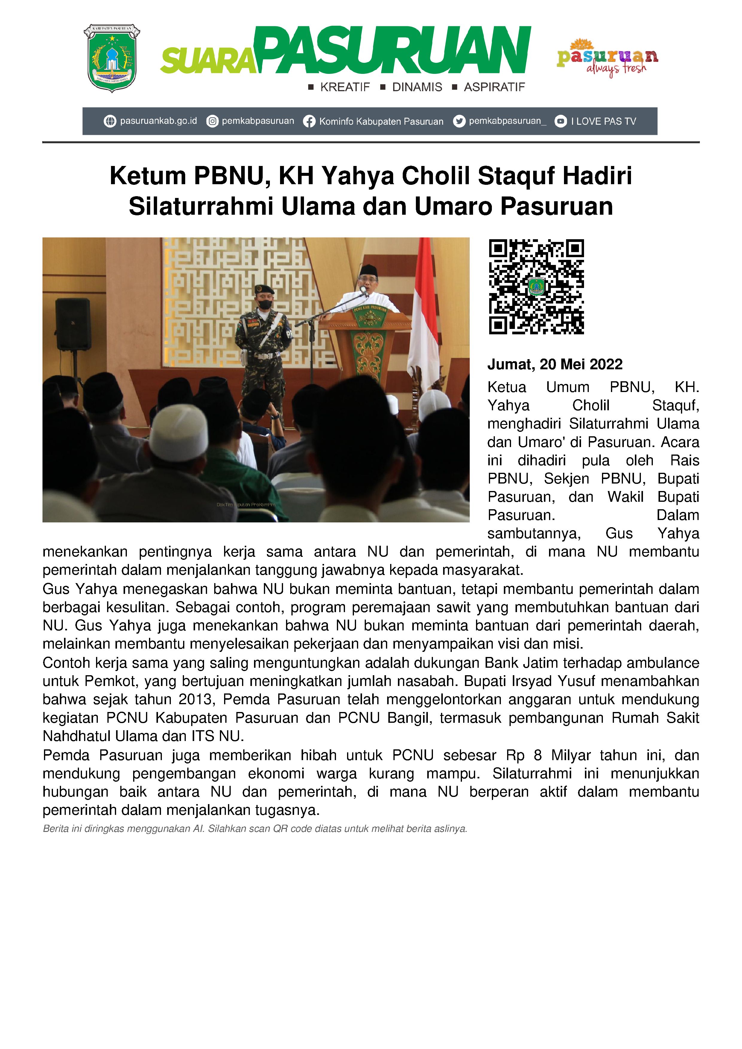 Ketua Umum Pengurus Besar Nahdhatul Ulama (Ketum PBNU), KH. Yahya Cholil Staquf menghadiri Silaturrahmi Ulama dan Umaro' Kota dan Kabupaten Pasuruan.