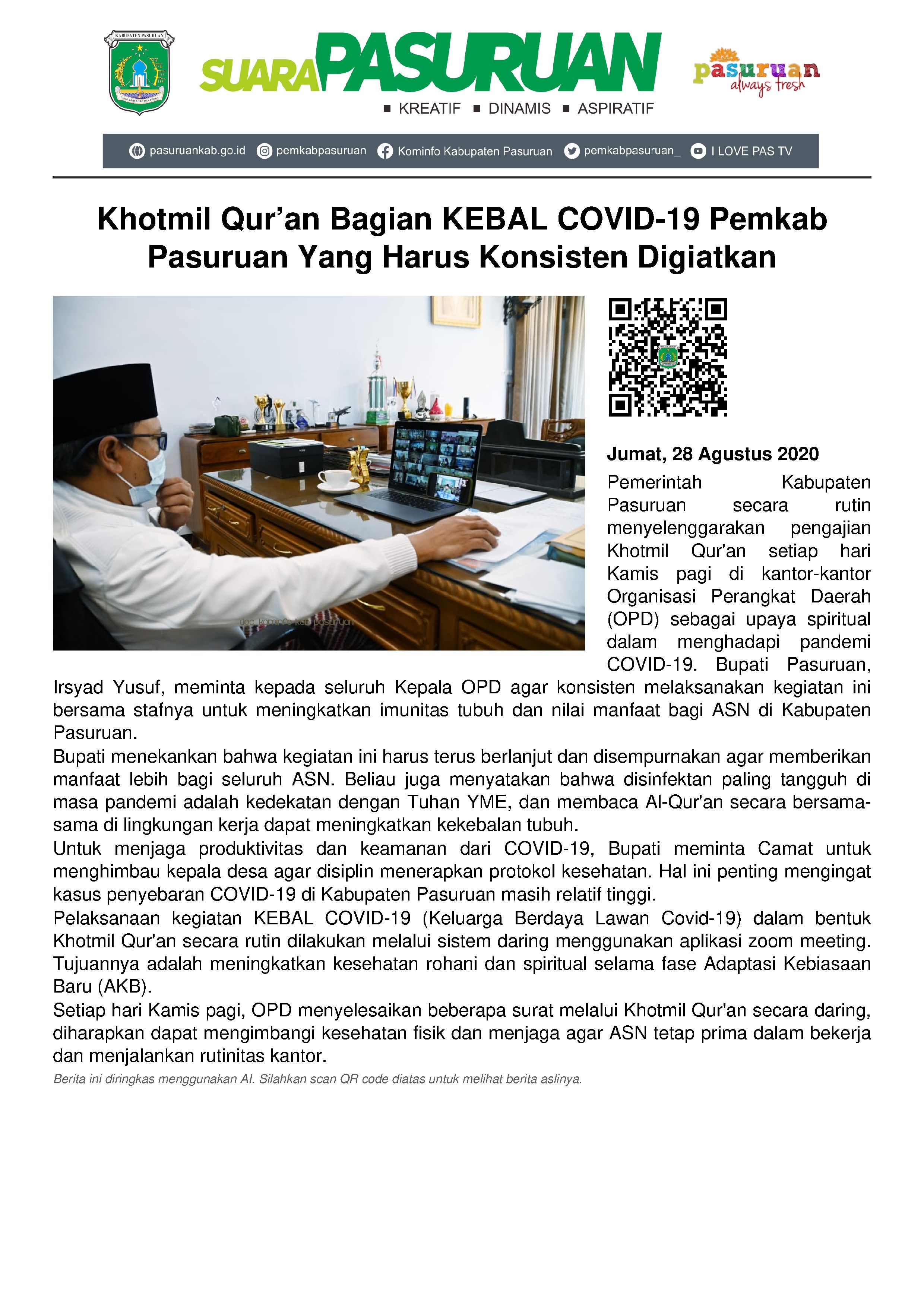 Dalam pelaksanaannya, kegiatan KEBAL COVID-19 (Keluarga Berdaya Lawan Covid-19) dalam bentuk Khotmil Qur’an secara rutin diselenggarakan Pemkab Pasuruan melalui sistem daring menggunakan aplikasi zoom meeting. Tujuannya untuk meningkatkan kesehatan rohani dan spiritual selama fase penerapan Adaptasi Kenormalam Baru (AKB). Setiap hari Kamis pagi, OPD berkewajiban untuk menyelesaikan beberapa surat. Harapannya mampu mengimbangi kesehatan fisik agar tetap prima selama berkarya dan melakukan kegiatan rutinitas kantor. (Eka Maria)