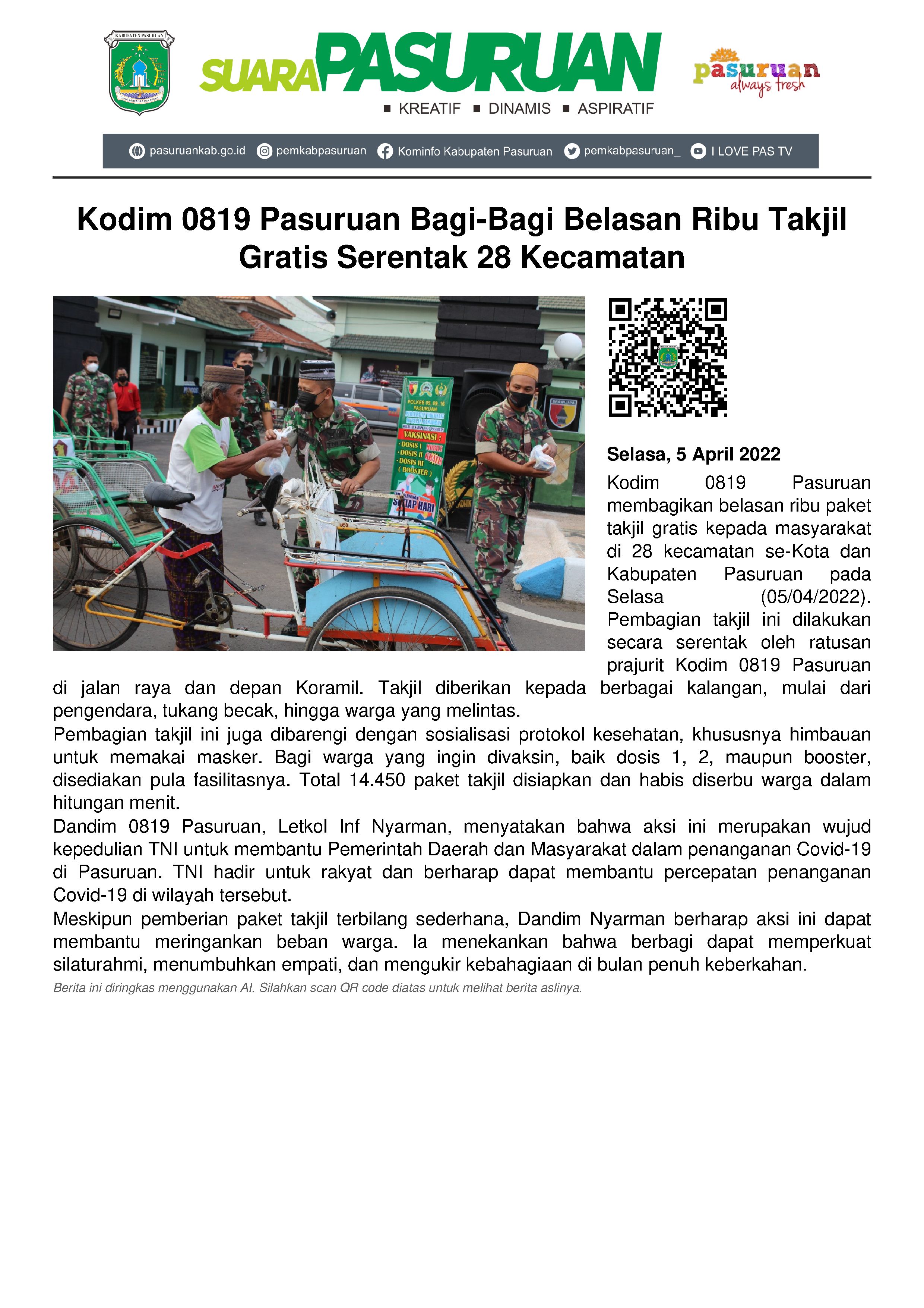 Ratusan prajurit Kodim 0819 Pasuruan bagi-bagi belasan ribu paket takjil gratis, Selasa (05/04/2022) sore.