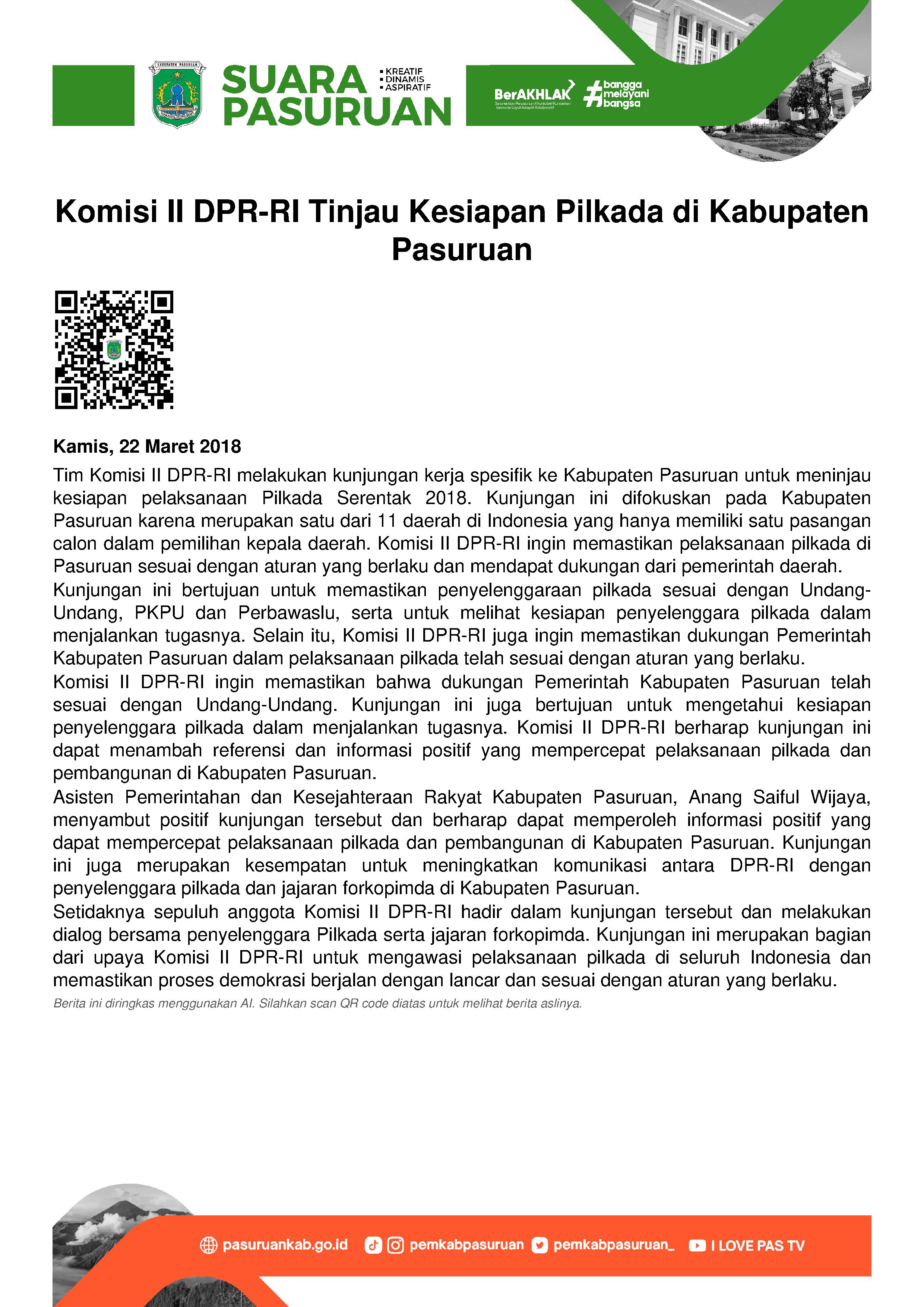 Sementara itu menurut Asisten Pemerintahan dan Kesejahteraan Rakyat Kabupaten Pasuruan, Anang Saiful Wijaya yang mewakili Bupati Pasuruan, Irsyad Yusuf mengatakan dengan adanya kunjungan kerja spesifik persiapan dan kesiapan pelaksanaan Pilkada Serentak 2018 oleh DPR-RI ini dirasa cukup penting terlebih dalam menyambut pesta demokrasi.