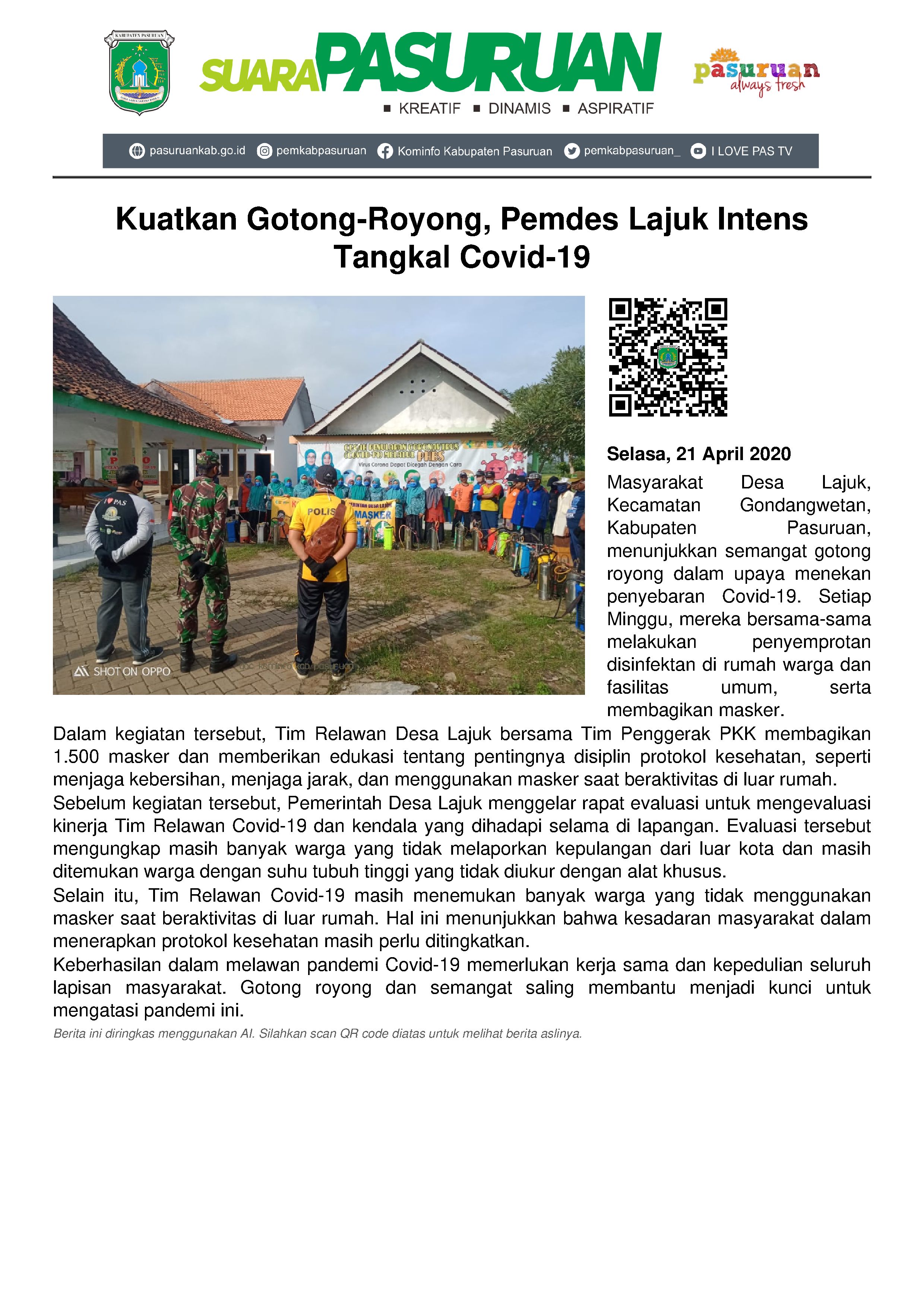 Demikian halnya dengan masyarakat di Kabupaten Pasuruan yang semakin guyub dalam upaya memutus mata rantai penyebaran Covid-19 di wilayah tempat tinggal masing-masing. Seperti yang terus digaungkan oleh Pemerintah Desa Lajuk, Kecamatan Gondangwetan setiap saat di setiap hari Minggu, misalnya.