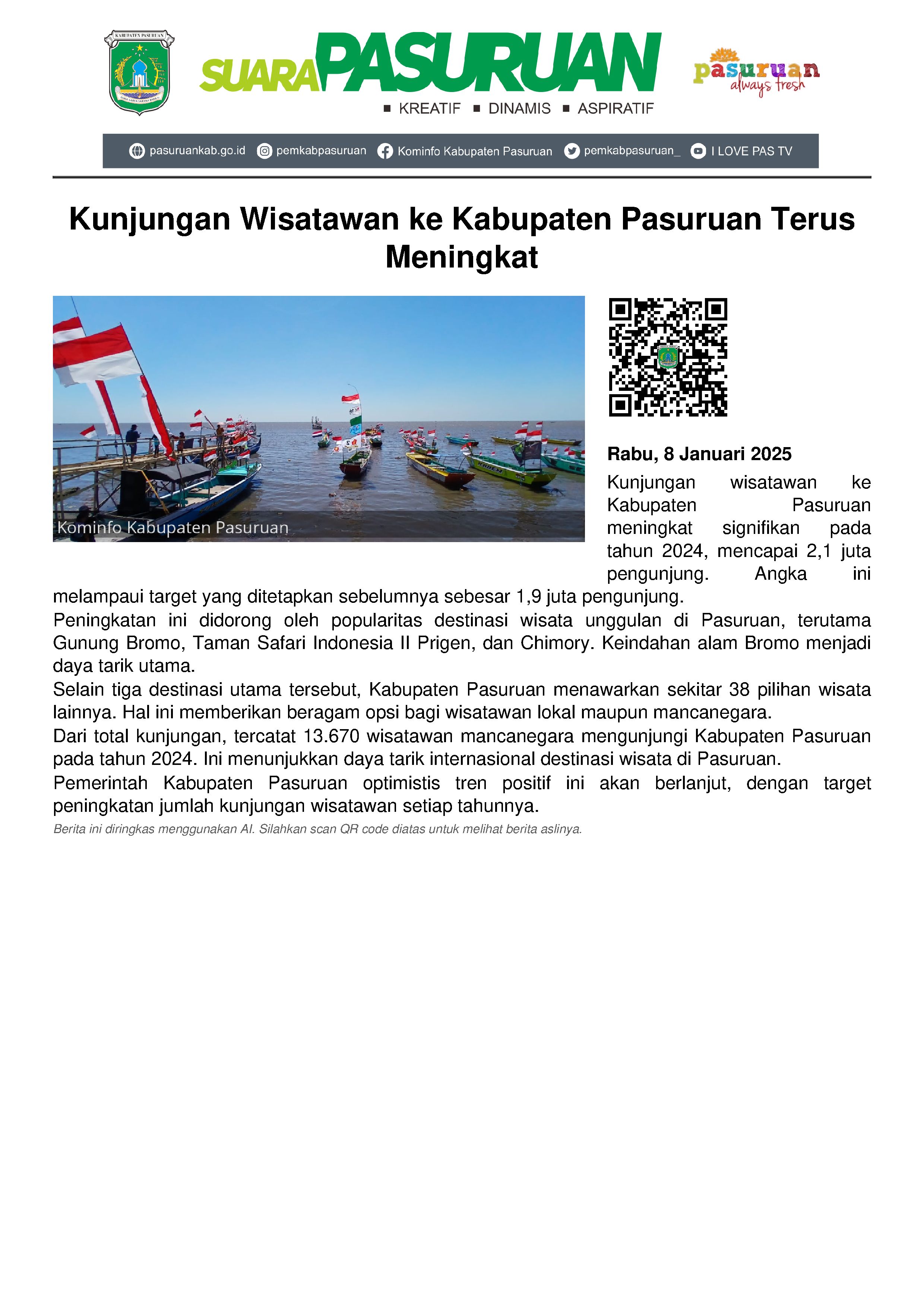 Sepanjang tahun 2024 kemarin, total 2,1 wisatawan yang menghabiskan liburannya ke objek wisata, baik alam maupun buatan di Kabupaten Pasuruan.