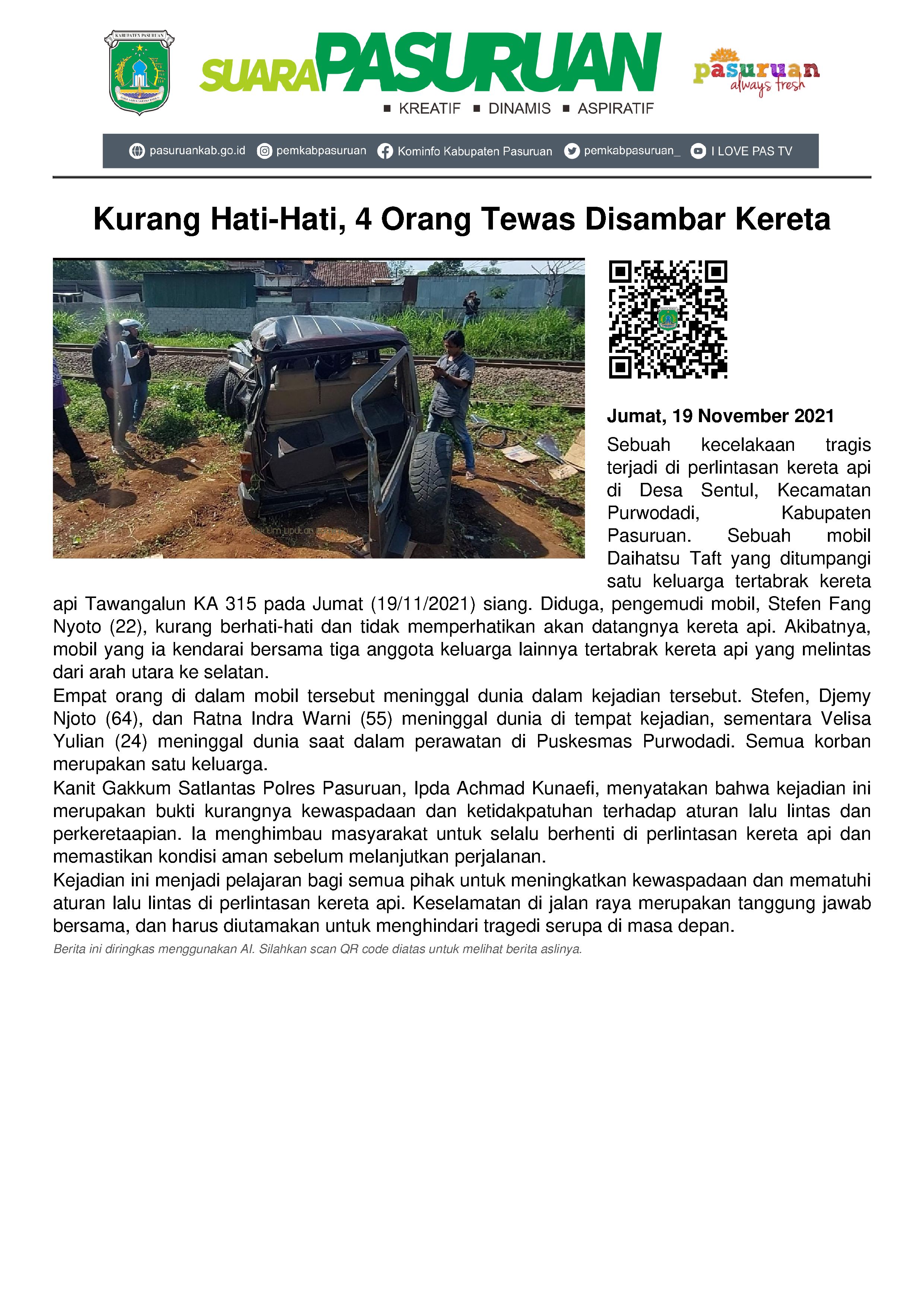 Kali ini adalah satu keluarga yang tewas di tempat kejadian perkara (TKP), setelah mobil Daihatsu Taft Nopol N-1898- yang mereka tumpangi, tertabrak kereta api Tawangalun KA 315, di perlintasan sebidang antara jalur kereta api dan Jalan Dusun Kampung Baru, Desa Sentul, Kecamatan Purwodadi, Kabupaten Pasuruan, Jumat (19/11/2021) siang.