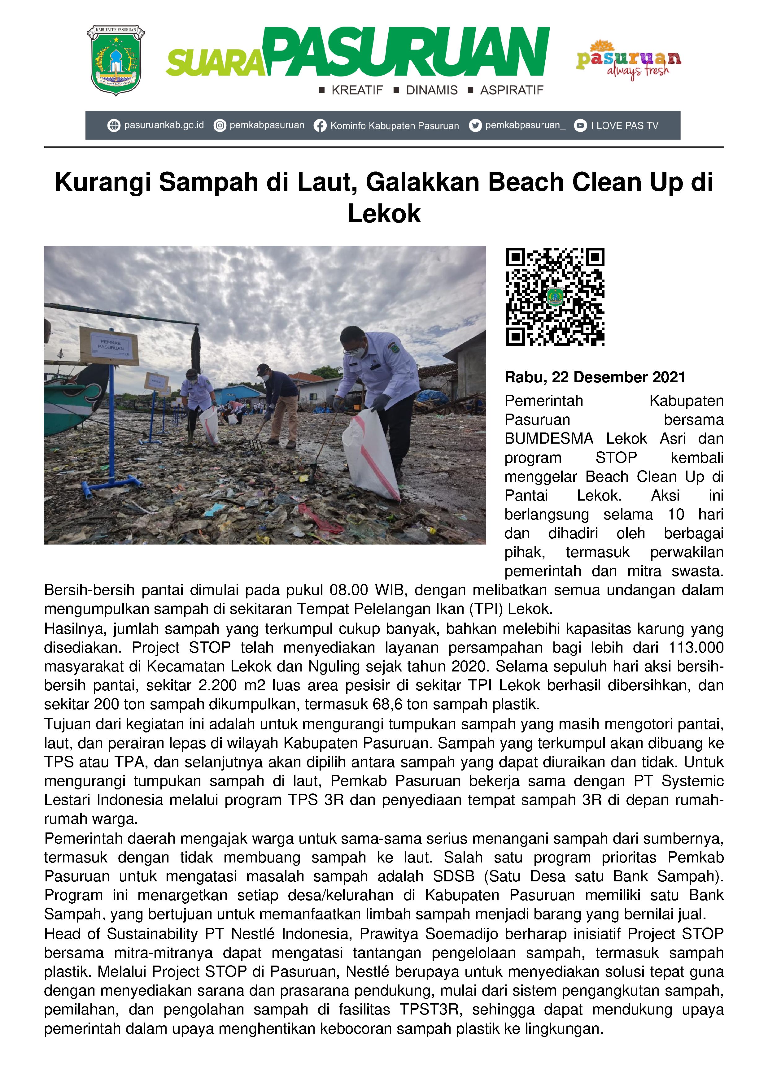 Untuk itu, Pemerintah Kabupaten Pasuruan bersama Badan Usaha Milik Desa Bersama (BUMDESMA) Lekok Asri dan program Stopping the Tap on Ocean Plastic (STOP) kembali menggelar Beach Clean Up alias bersih-bersih pantai.