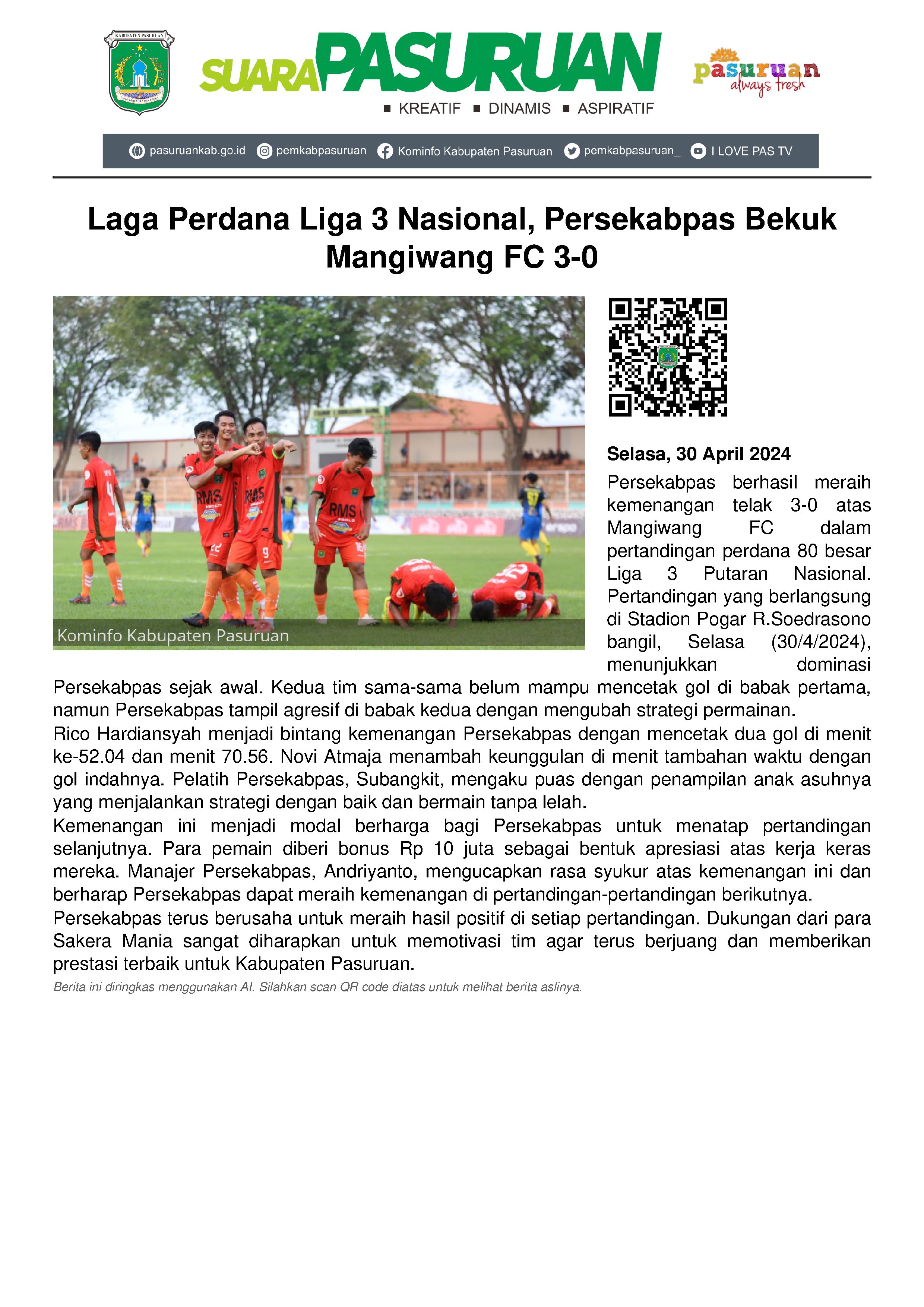 Persekabpas sukses menekuk Mangiwang FC dalam laga perdana 80 besar Liga 3 Putaran Nasional yang berlangsung di Stadion Pogar R.Soedrasono bangil, Selasa (30/4/2024) sore.