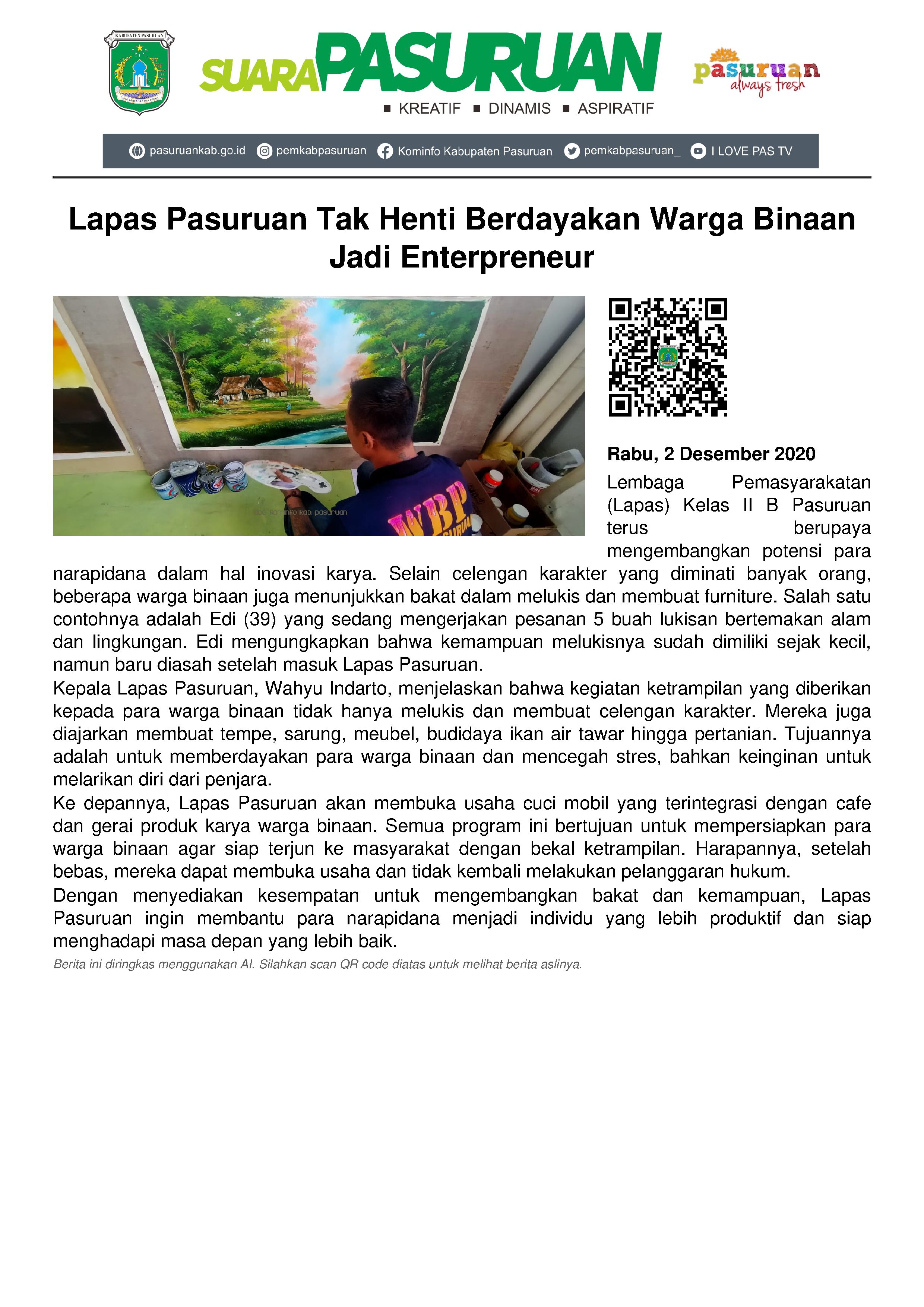 Sementara itu, Kepala Lapas Pasuruan, Wahyu Indarto menjelaskan, selama ini sudah banyak kegiatan ketrampilan yang diberikan kepada para warga binaan selain melukis dan membuat celengan karakter. Diantaranya pembuatan tempe, sarung, las, meubel, budidaya ikan air tawar hingga pertanian terong, cabai dan lainnya.