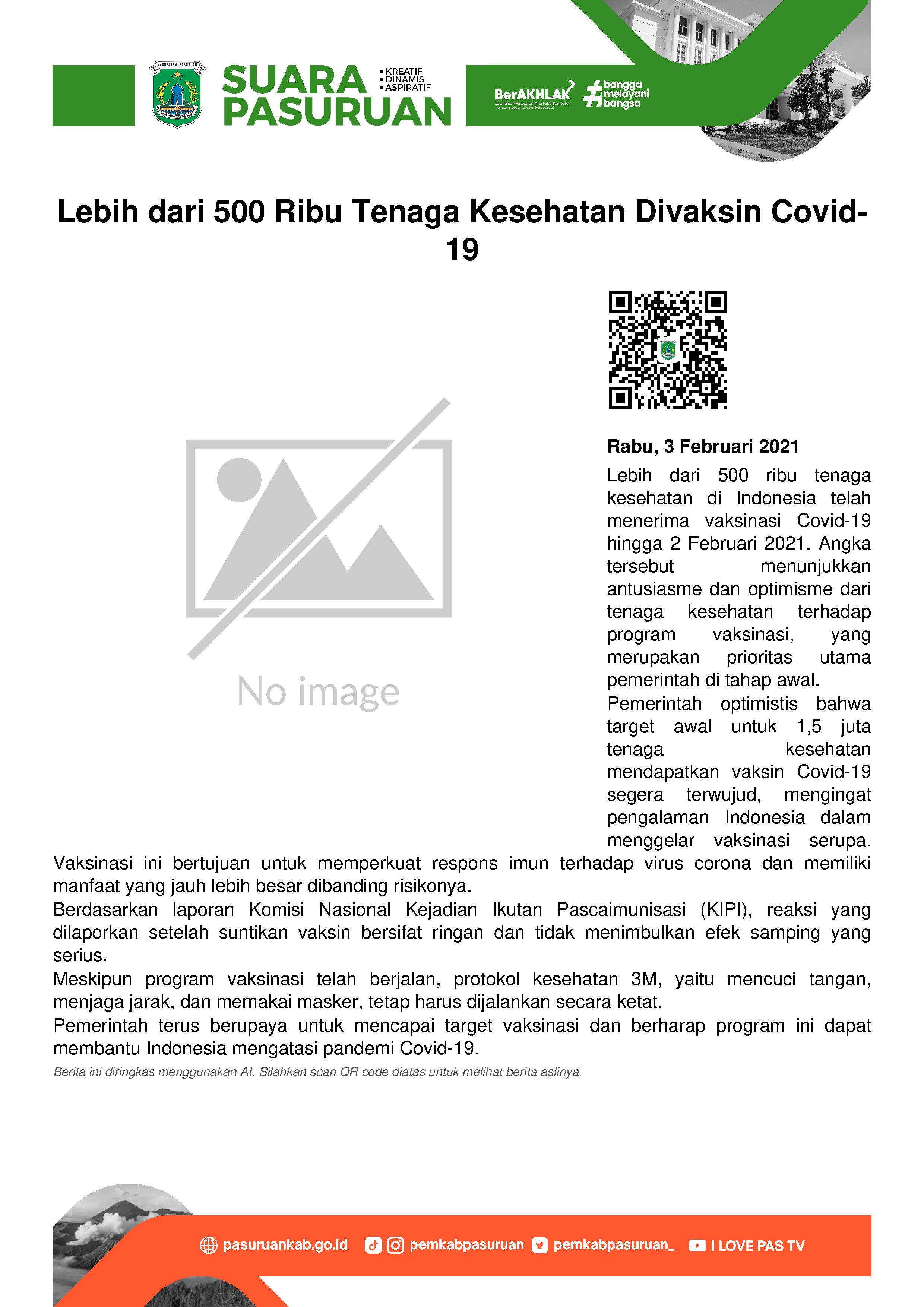 "Hingga kemarin, kita telah berhasil melakukan vaksinasi bagi lebih dari 500 ribu tenaga kesehatan di Indonesia. Angka tersebut menunjukkan antusiasme yang luar biasa dari tenaga kesehatan untuk mendukung program vaksinasi yang sekaligus juga menunjukkan optimisme mereka terhadap keamanan dan manfaat vaksin dalam memberikan perlindungan terhadap diri mereka dari Covid-19", tuturnya seperti yang diberitakan di laman setneg.go.id.