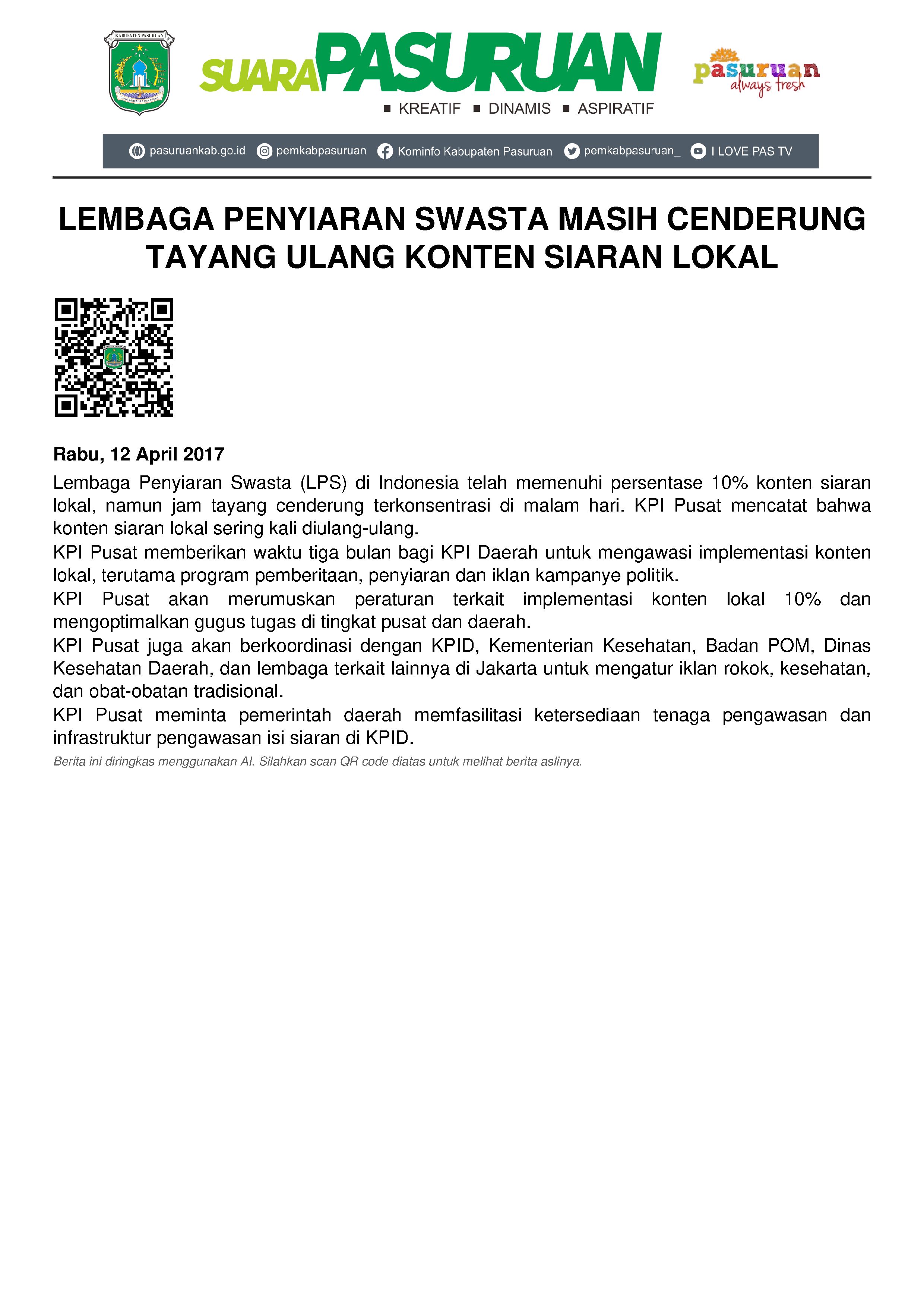 “Secara umum, konten lokal di daerah secara persentase terpenuhi. Namun, jam tayang konten lokal masih pada jam-jam malam. Itupun dengan konten siaran yang cenderung diulang-ulang. Untuk itu, kami akan merumuskan peraturan tentang implementasi konten lokal 10 persen tersebut ke Lembaga Penyiaran, berikut akan mengoptimalisasi gugus tugas dari tingkat pusat sampai tingkat daerah”, urainya.