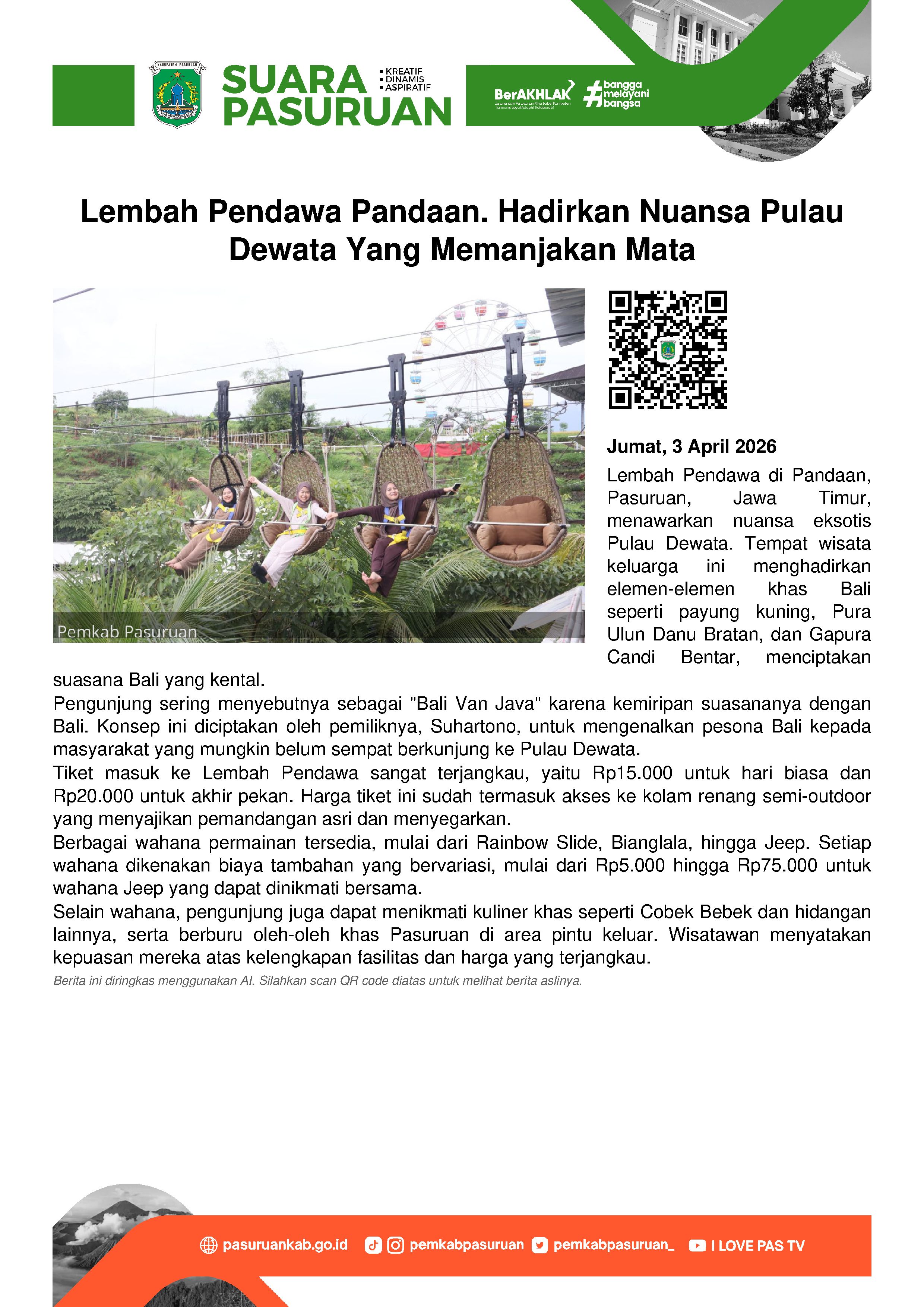 "Bali itu ikon wisata Indonesia. Semua warga di dunia tahu Bali, makanya kami hadirkan nuansa bali di Lembah Pendawa, supaya orang yang belum pernah ke Bali, minimal tahu Bali dari sini," kata Suhartono di sela-sela kesibukannya, Jumat (3/4/2026).