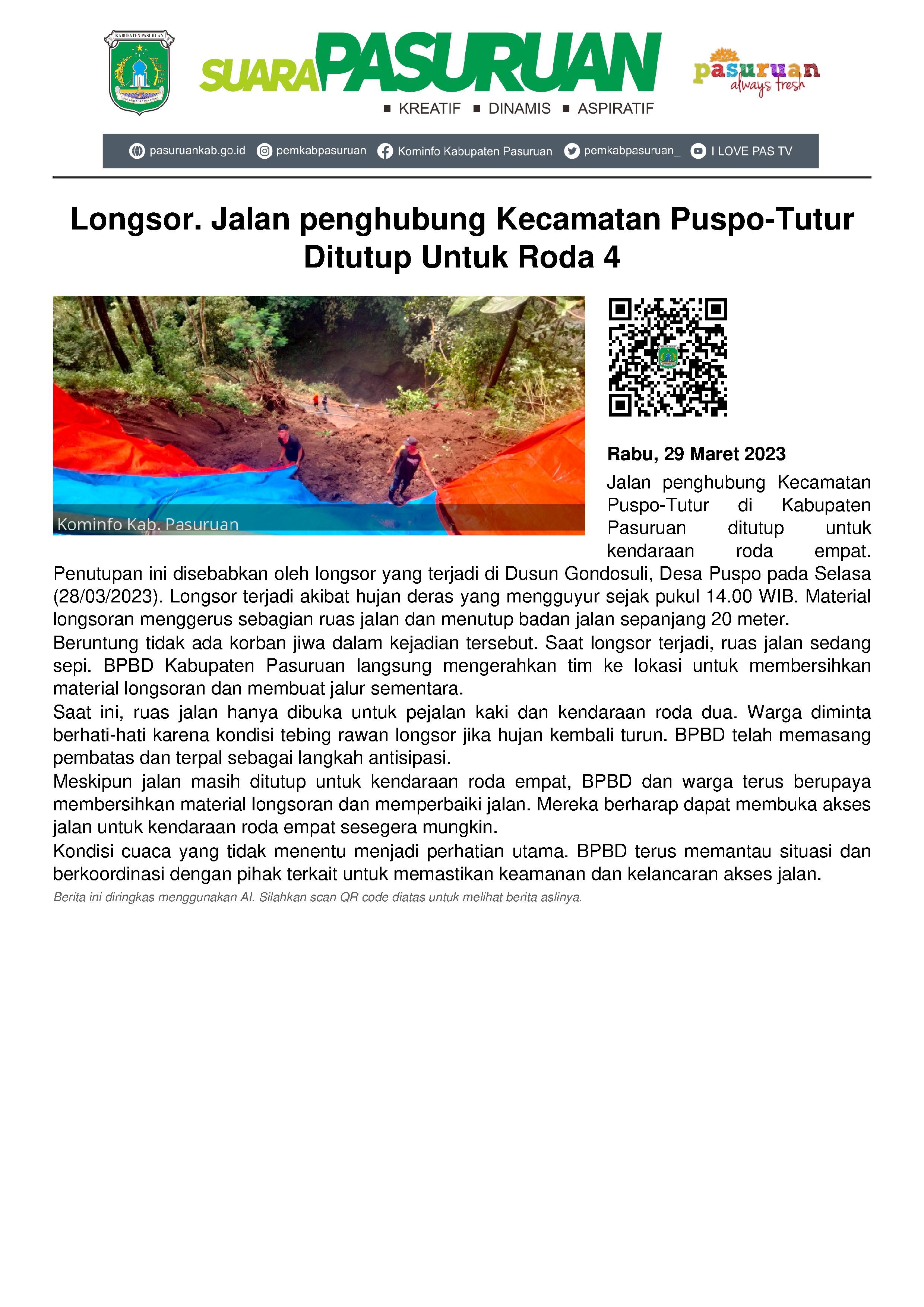 Penutupan jalan ini sangat penting, sebab tebing di atas ruas jalan yang masuk Dusun Gondosuli, Desa Puspo mengalami longsor pada selasa (28/03/2023) petang kemarin.