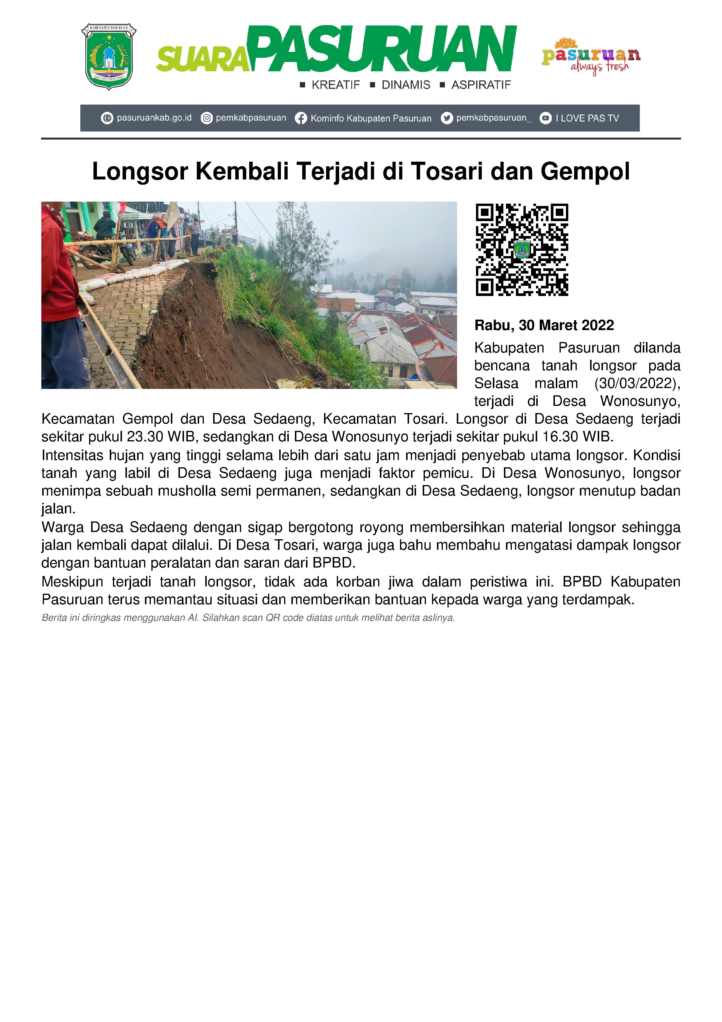 Kepala Pelaksana BPBD (Badan Penanggulangan Bencana Daerah) Kabupaten Pasuruan, Ridwan Harris mengatakan, longsor terjadi di dua wilayah, yakni Desa Wonosunyo, Kecamatan Gempol serta di Desa Sedaeng, Kecamatan Tosari.