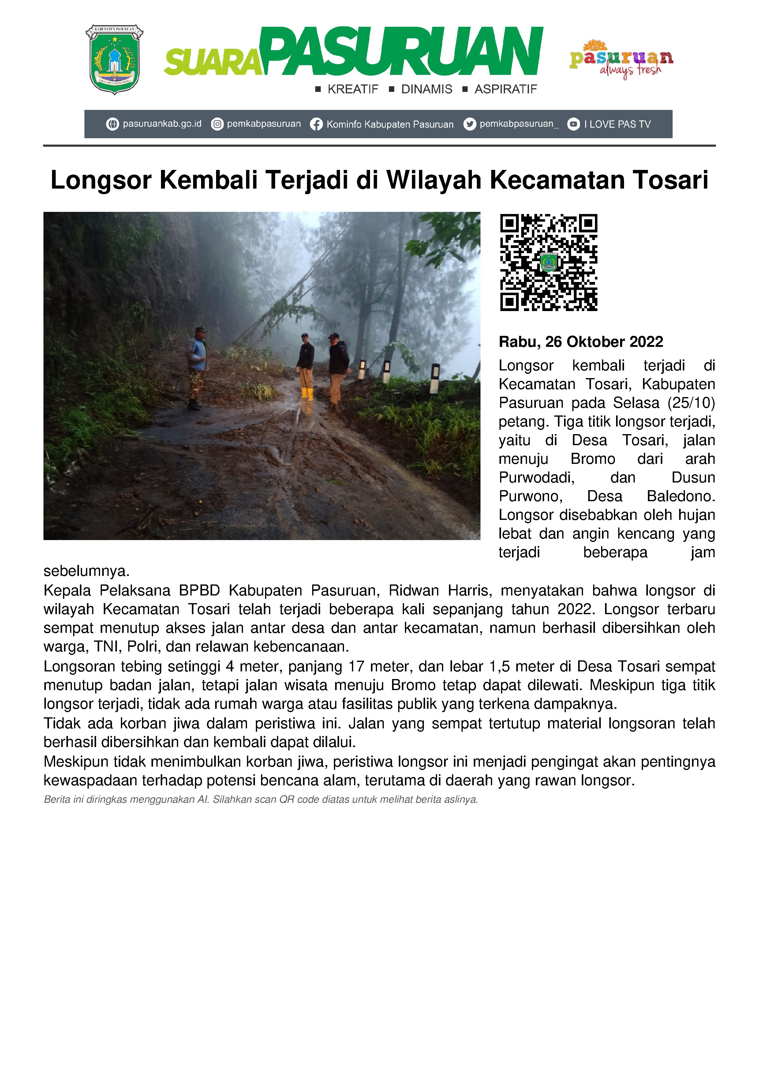 Dijelaskannya, kejadian tanah longsor di wilayah Kecamatan Tosari sudah beberapa kali terjadi sepanjang tahun 2022. Bahkan longsor kali ini sempat menutup akses jalan antar desa maupun antar kecamatan. Sebelum akhirnya bisa dibuka kembali setelah warga bersama TNI dan POLRI hingga relawan kebencanaan bergotong royong membersihkan sisa material longsoran.