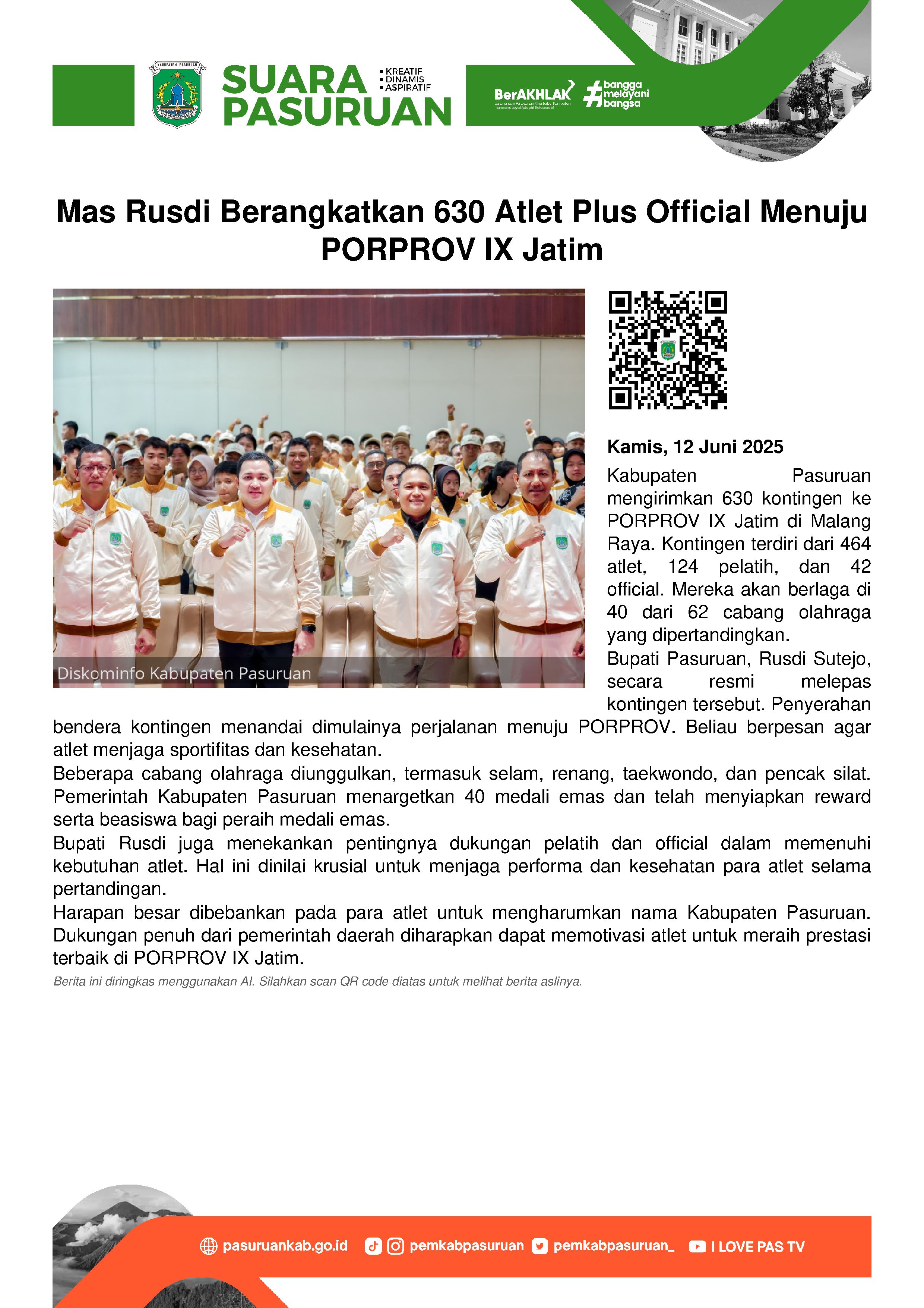 Sebelum berangkat, ratusan atlet plus pelatih dan official tersebut dilepas secara resmi oleh Bupati Pasuruan, Rusdi Sutejo dari Auditorium Mpu Sindok, Komplek Kantor Bupati Pasuruan, Kamis (12/6/2025) pagi.