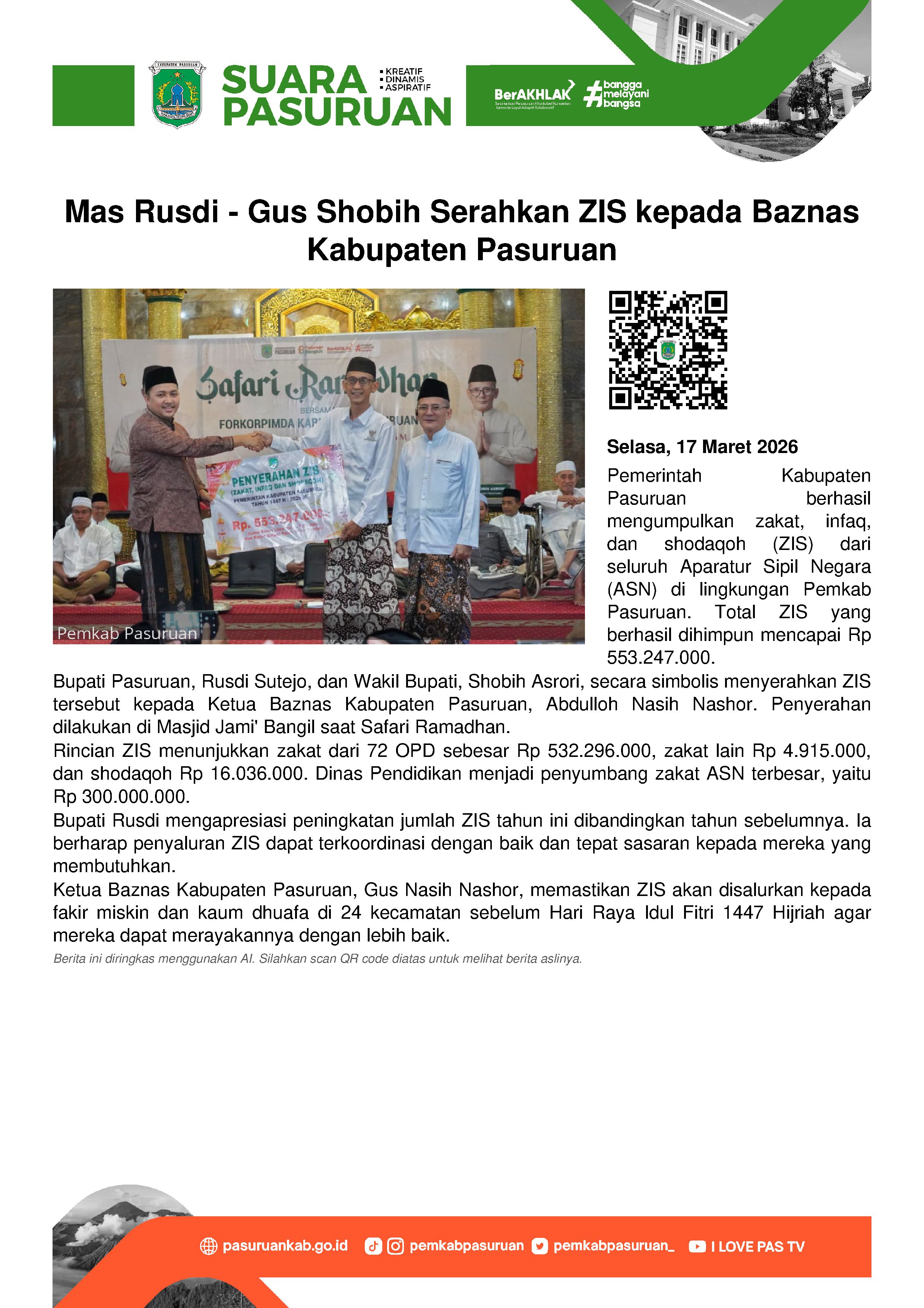 Hingga hari terakhir pengumpulan, total zakat, infaq dan shodaqoh mencapai Rp 553,247,000 dan secara simbolis diserahkan oleh Bupati Pasuruan, Rusdi Sutejo dan Wakil Bupati Shobih Asrori kepada Ketua Baznas Kabupaten Pasuruan, Abdulloh Nasih Nashor di sela-sela Safari Ramadhan di Masjid Jami' Bangil, Senin (16/3/2026) sore.