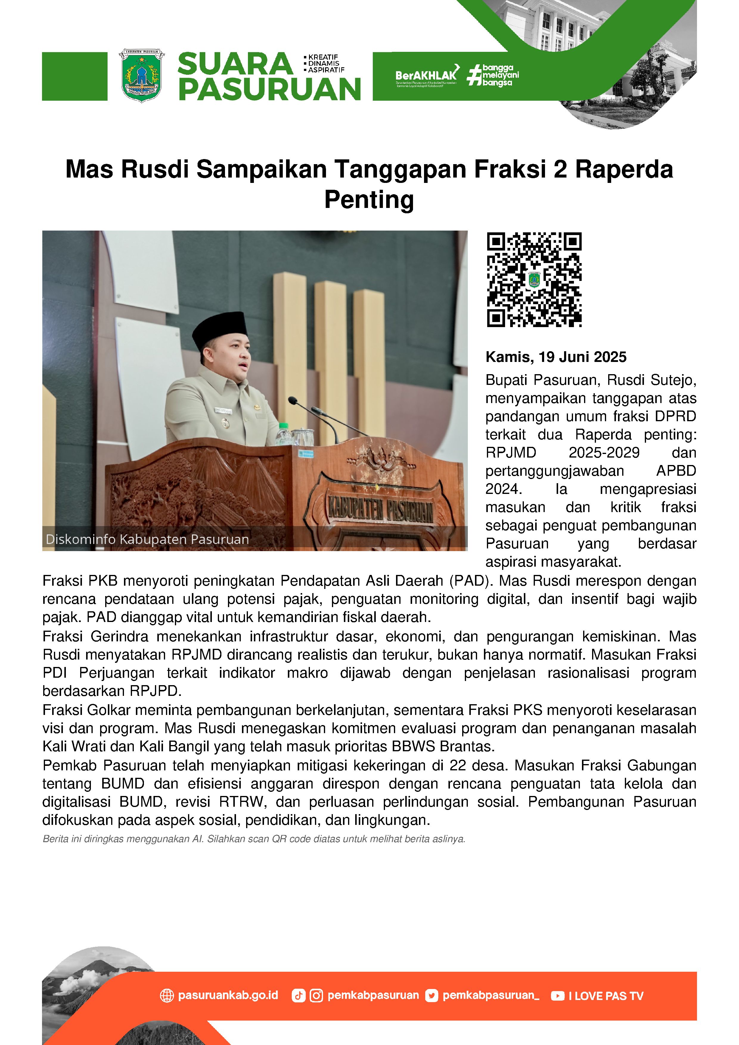 Kali ini, Mas Rusdi - sapaan akrabnya menyampaikan tanggapan resmi atas pandangan umum fraksi-fraksi DPRD Kabupaten Pasuruan terhadap dua rancangan peraturan daerah penting. Yakni Raperda Rencana Pembangunan Jangka Menengah Daerah (RPJMD) Kabupaten Pasuruan Tahun 2025–2029 dan Raperda Pertanggungjawaban Pelaksanaan APBD Tahun Anggaran 2024.