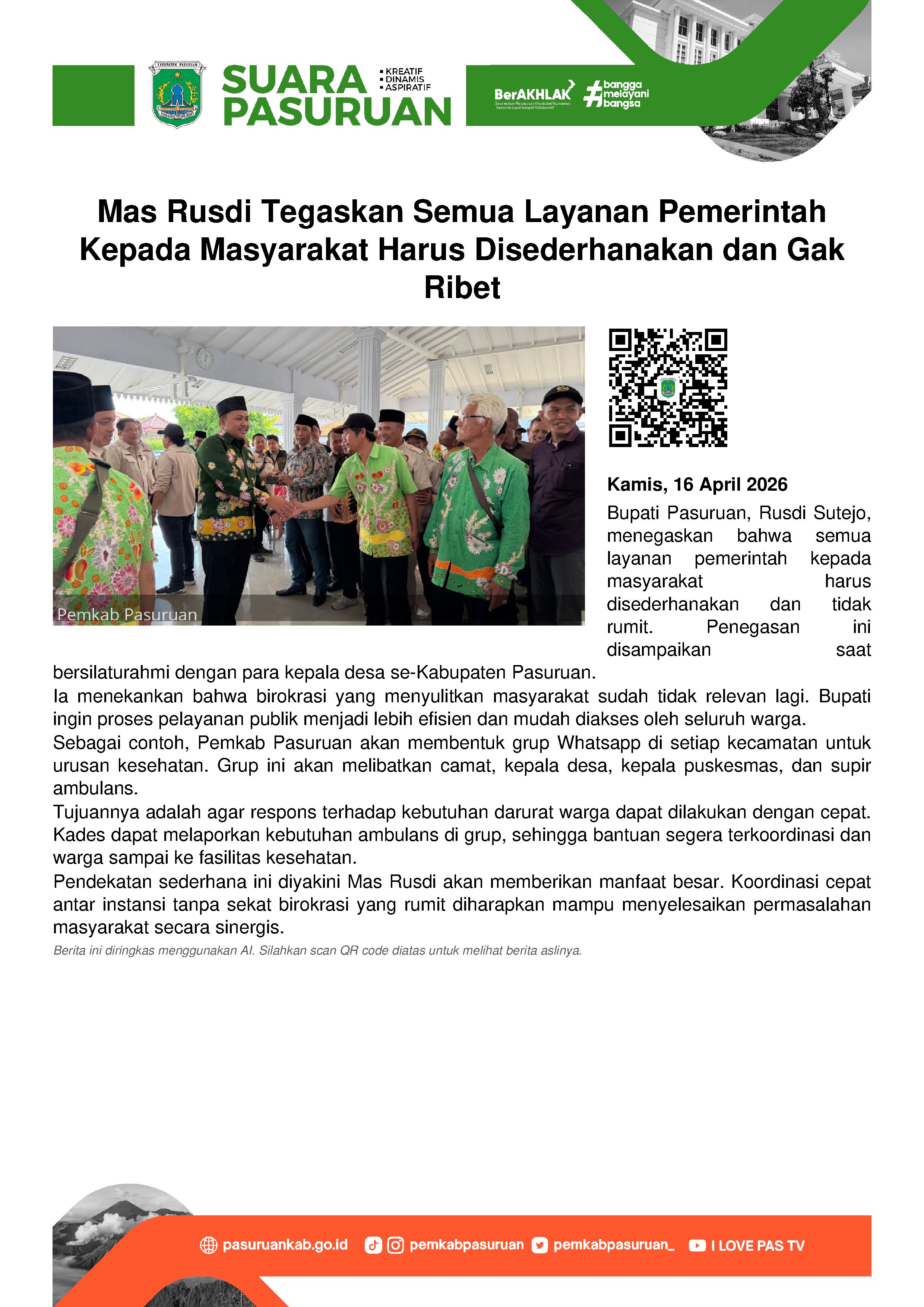 Penegasan ini disampaikan Mas Rusdi – sapaan akrab Bupati Pasuruan ini saat bersilaturrahmi dengan para kepala desa se-Kabupaten Pasuruan, di Pendopo Nyawiji Ngesti Wenganing Gusti, Kamis (16/4/2026) siang.