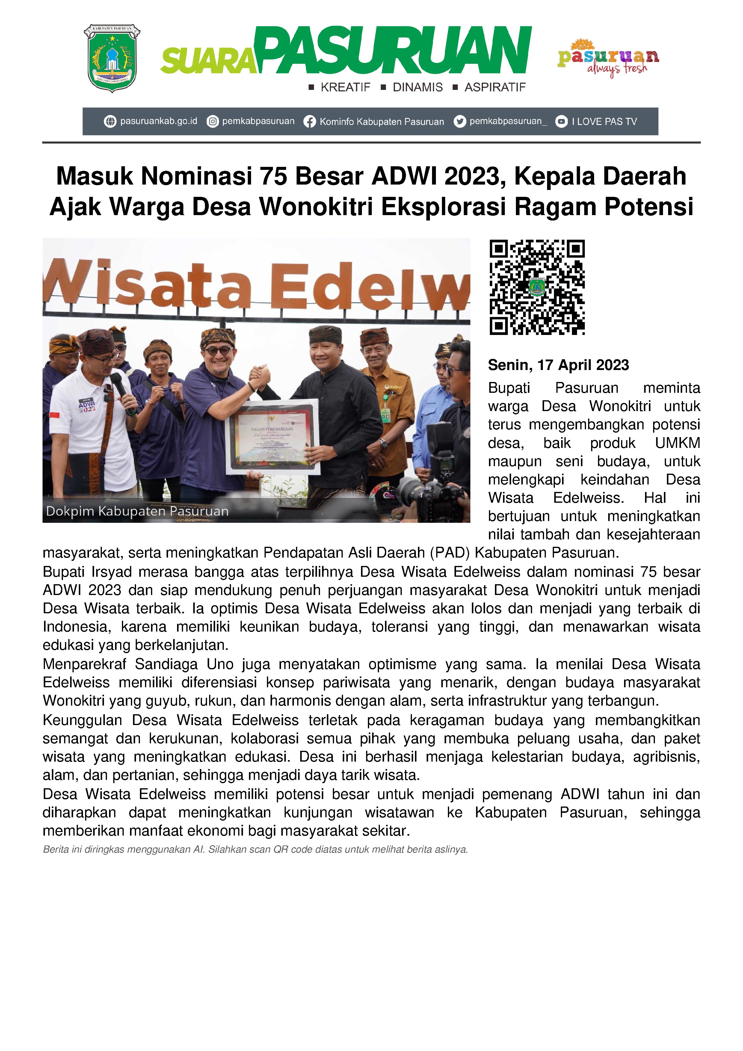 "Tentu pada akhirnya kan pariwisata memberikan manfaat atau multipflier effect bagi masyarakat. Kalau ada tempat wisata, maka pasti masyarakat sekitar akan mendapatkan manfaatnya. Mudah-mudahan dengan masuknya Desa Wisata Edelweis Wonokitri dalam 75 besar Desa Wisata Terbaik ADWI 2023 akan semakin memikat wisatawan untuk berkunjung ke Kabupaten Pasuruan," kata Kepala Daerah yang disampaikan dengan nada berspirit.