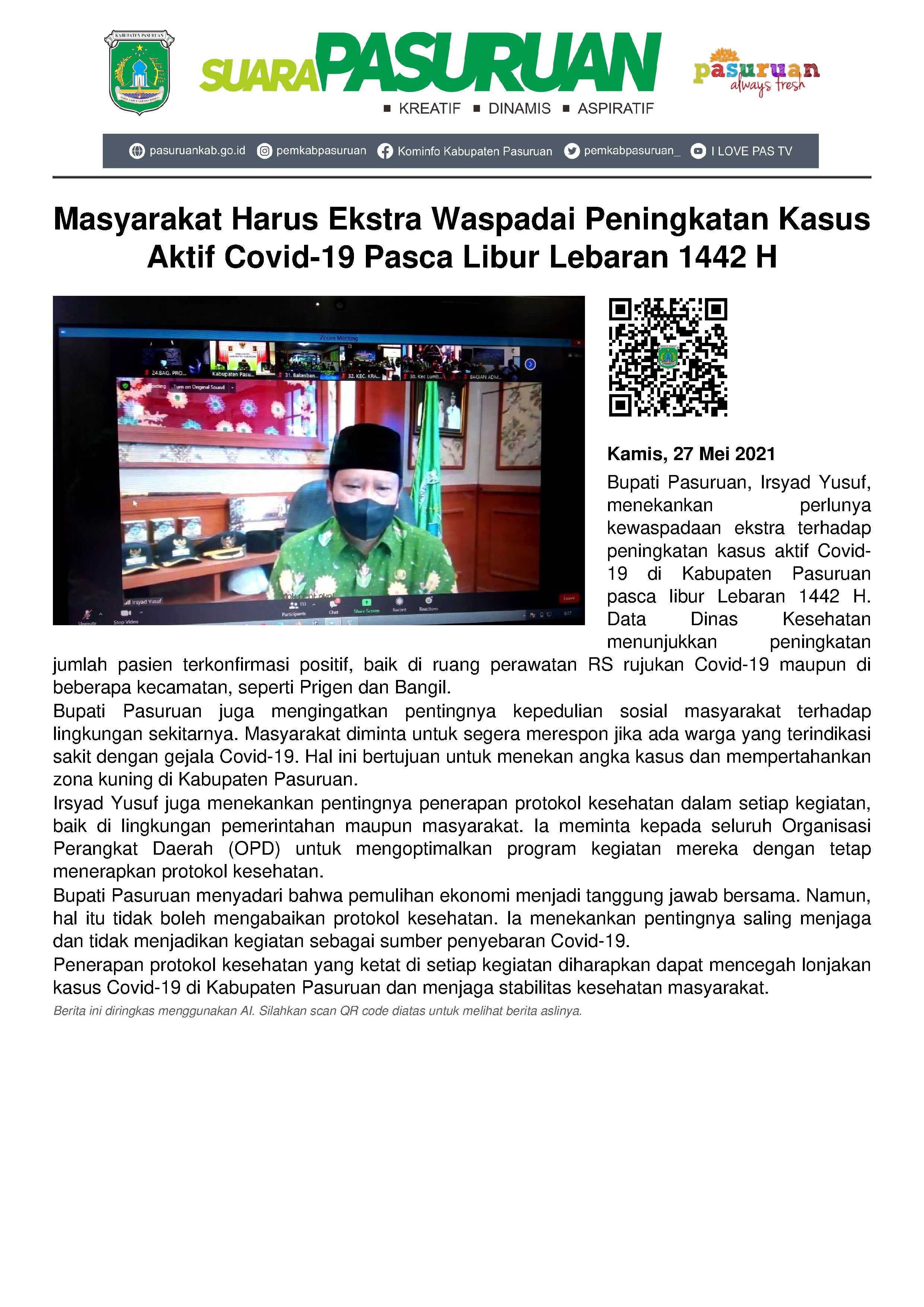 Seluruh masyarakat harus mewaspadai sekaligus mengantisipasi terjadinya lonjakan kasus aktif Covid-19 di Kabupaten Pasuruan. Terlebih hingga saat ini telah dilaporkan adanya peningkatan jumlah pasien terkonfirmasi positif. Penegasan itu disampaikan Bupati Pasuruan, Irsyad Yusuf yang disampaikan sesaat setelah pengajian rutin virtual Khotmil Qur’an digelar, Kamis (27/5/2021).