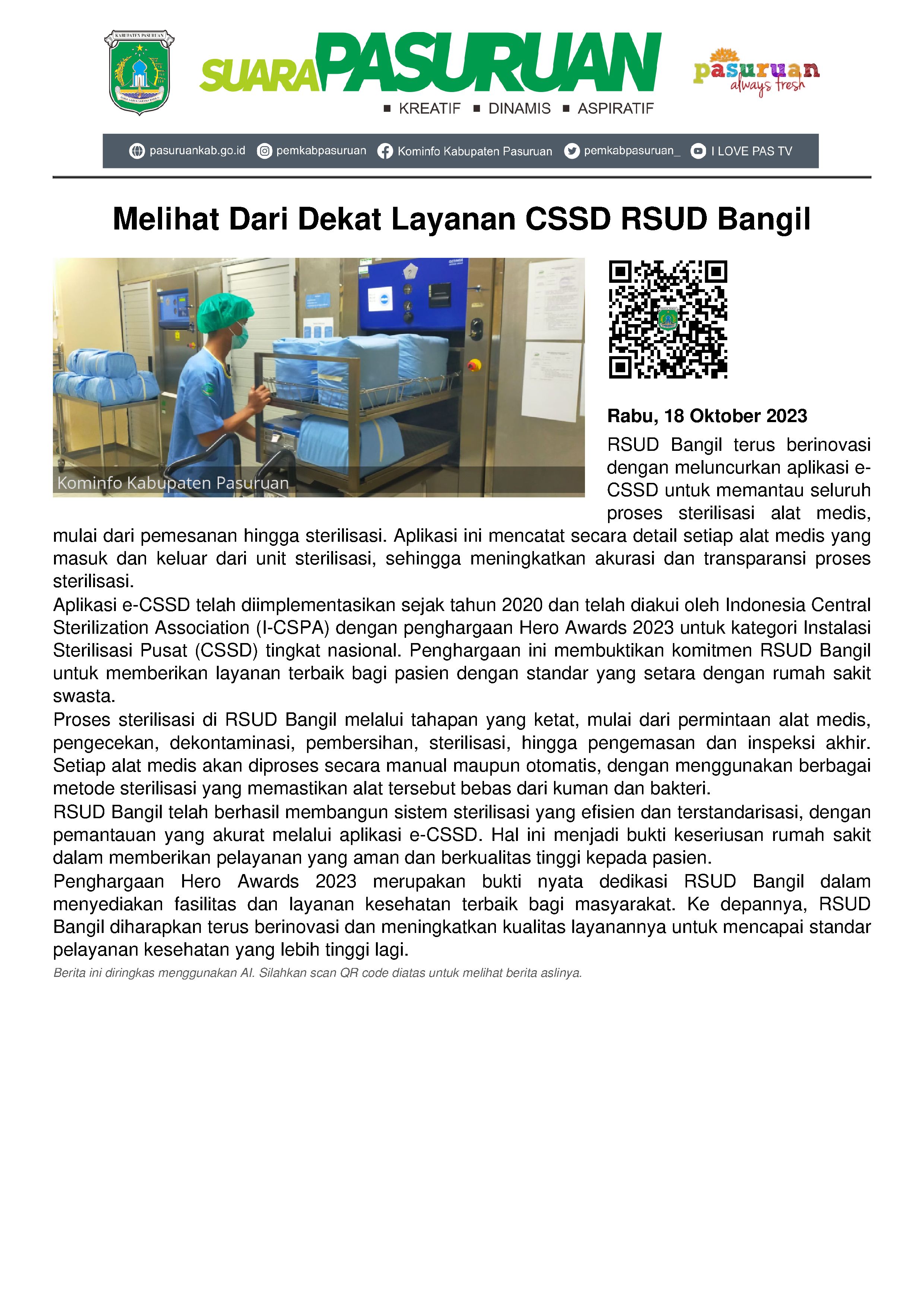Kali ini, rumah sakit kebanggaan warga Kabupaten Pasuruan ini mempunyai aplikasi Central Sterile Supply Department (e-CSSD).