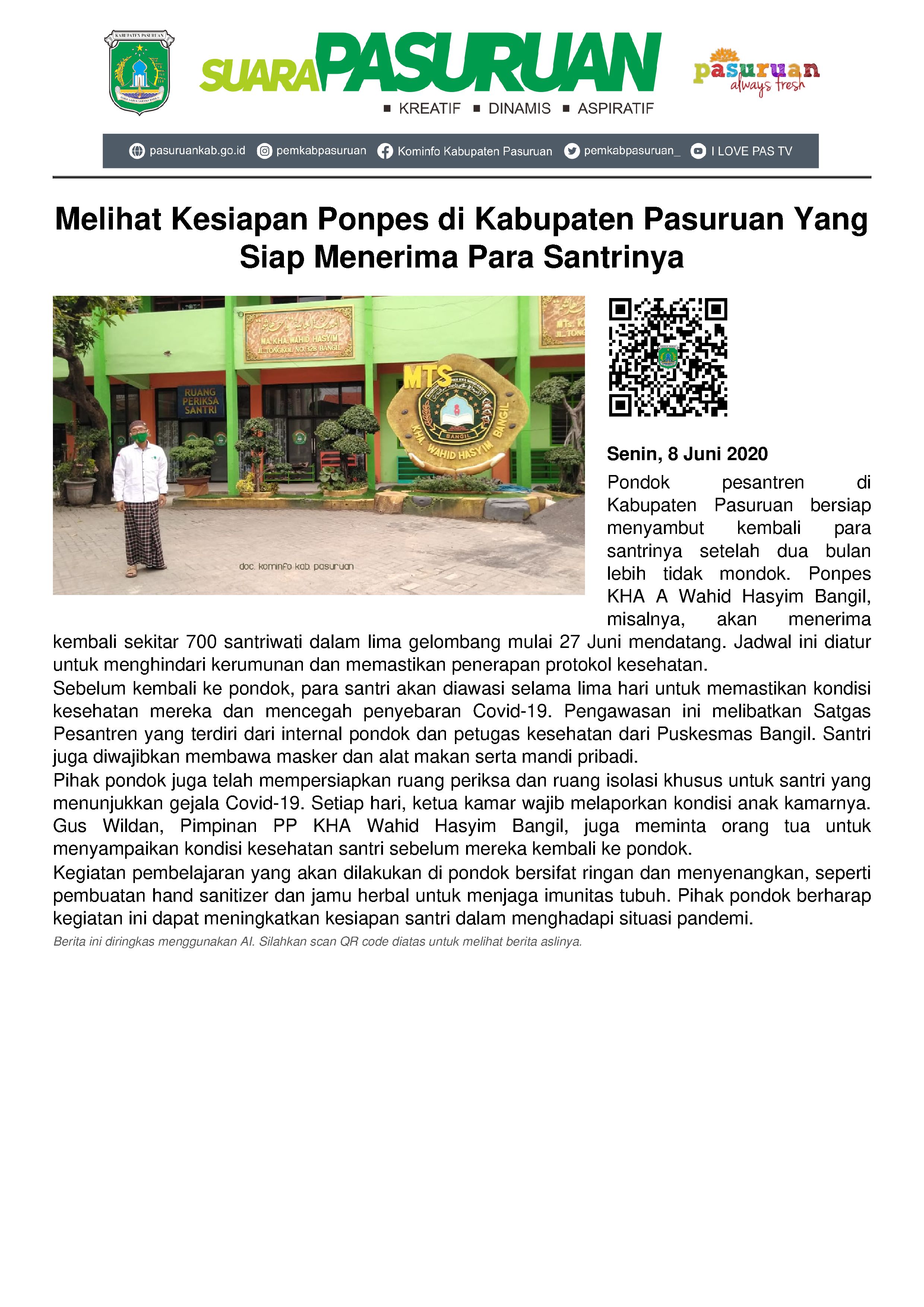Tak terkecuali di Kabupaten Pasuruan. Hampir seluruh pondok pesantren, kini sudah bersiap untuk menyambut para santri maupun santriwati yang dua bulan lebih tak lagi “Mondok”.