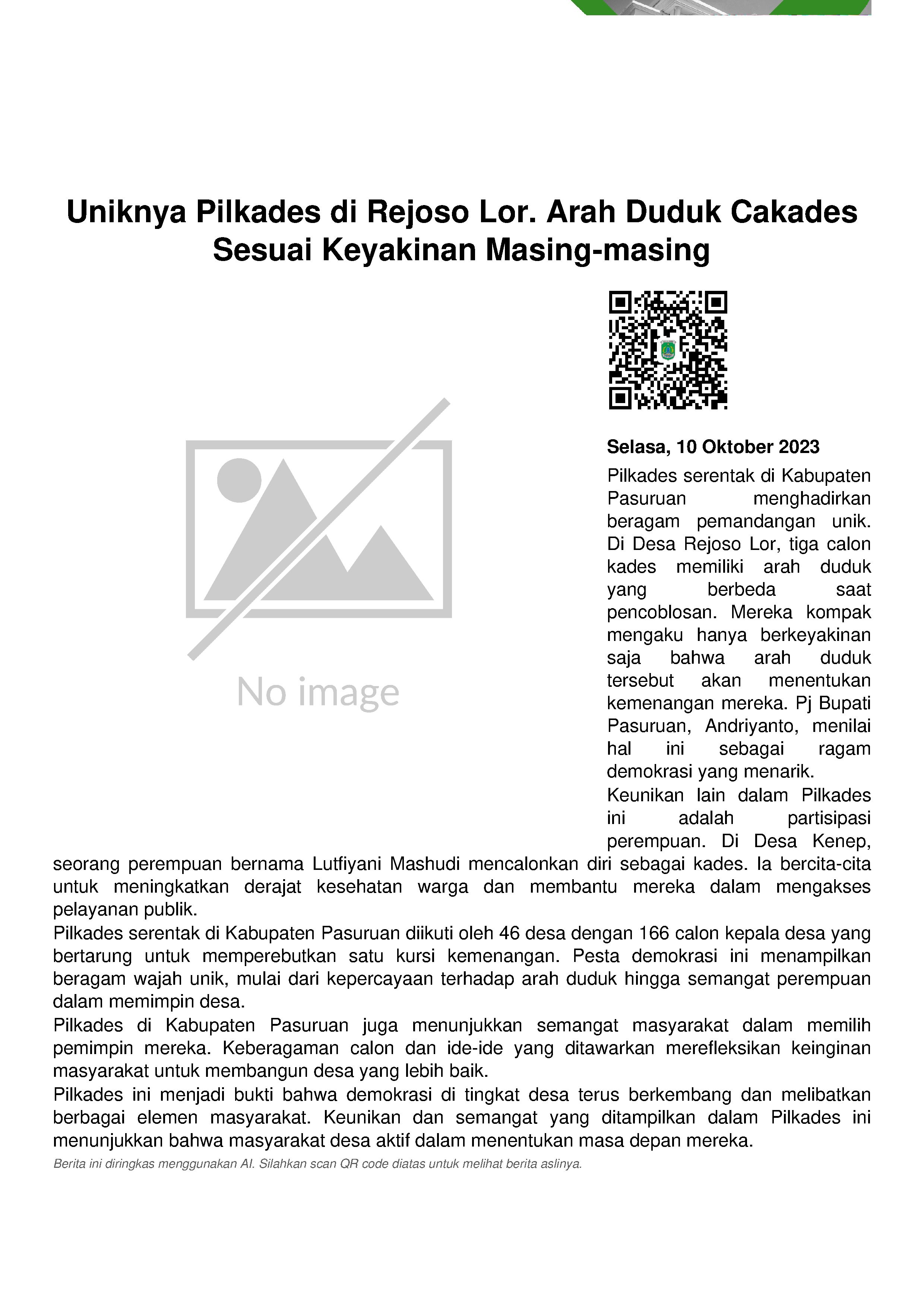 "Saya salut sekali. Ketika pilkades nggak ada yang mencalonkan diri, tapi panitia pilkades yang melamar beberapa orang untuk dicalonkan jadi kades. Kemudian beberapa orang itu berunding dan memutuskan siapa yang jadi kadesnya. Ini terjadi hanya di Tosari, di Kabupaten Pasuruan," contohnya.