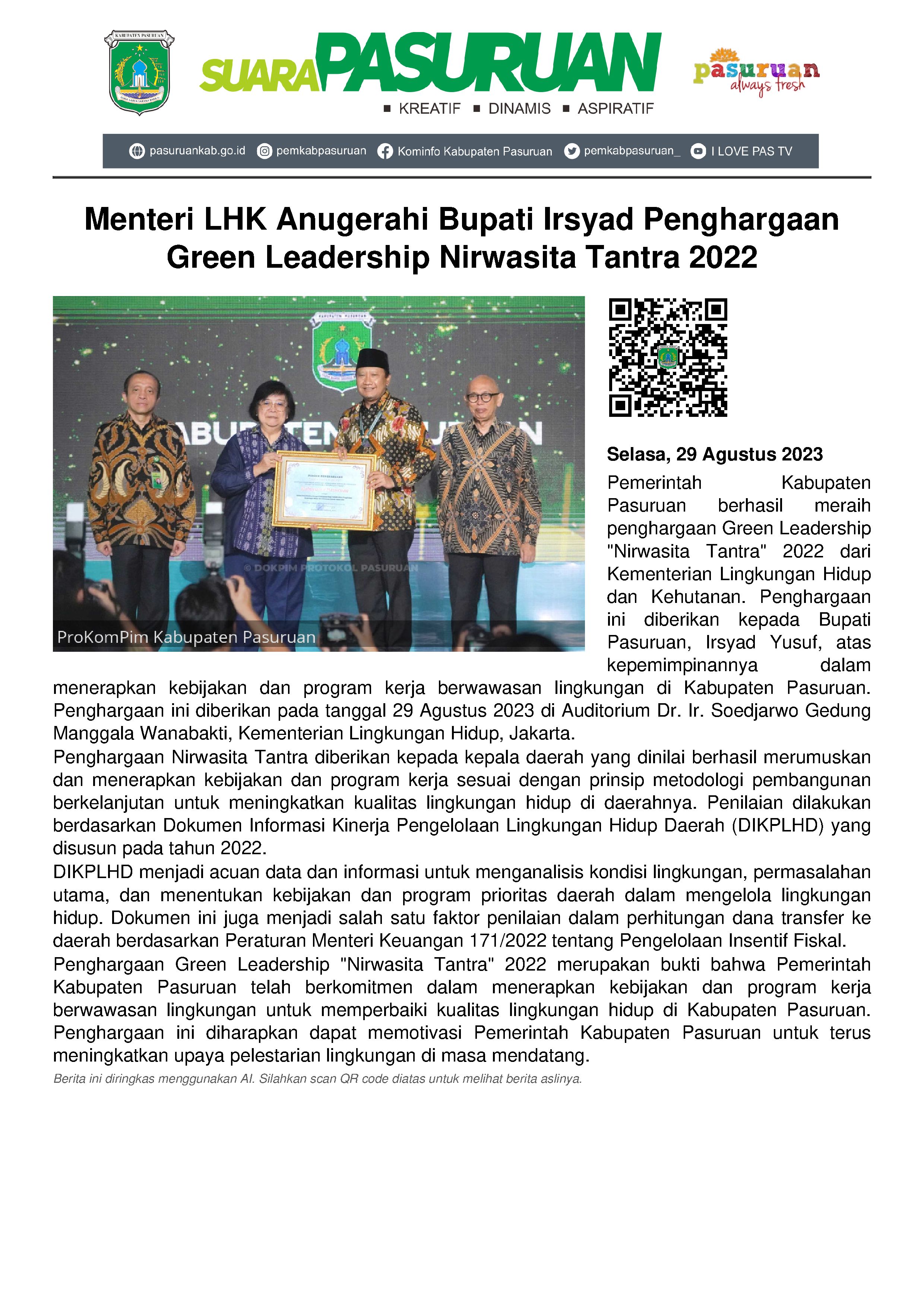 Di penghujung Agustus 2023, Pemerintah Kabupaten Pasuruan kembali menuai prestasi. Hari ini, Selasa (29/8/2023), Kementerian Lingkungan Hidup dan Kehutanan mengganjarnya dengan penghargaan Green Leadership "Nirwasita Tantra" 2022 kategori Pemerintah Daerah Tingkat Kabupaten. Adapun klasifikasinya, Kabupaten Besar.
