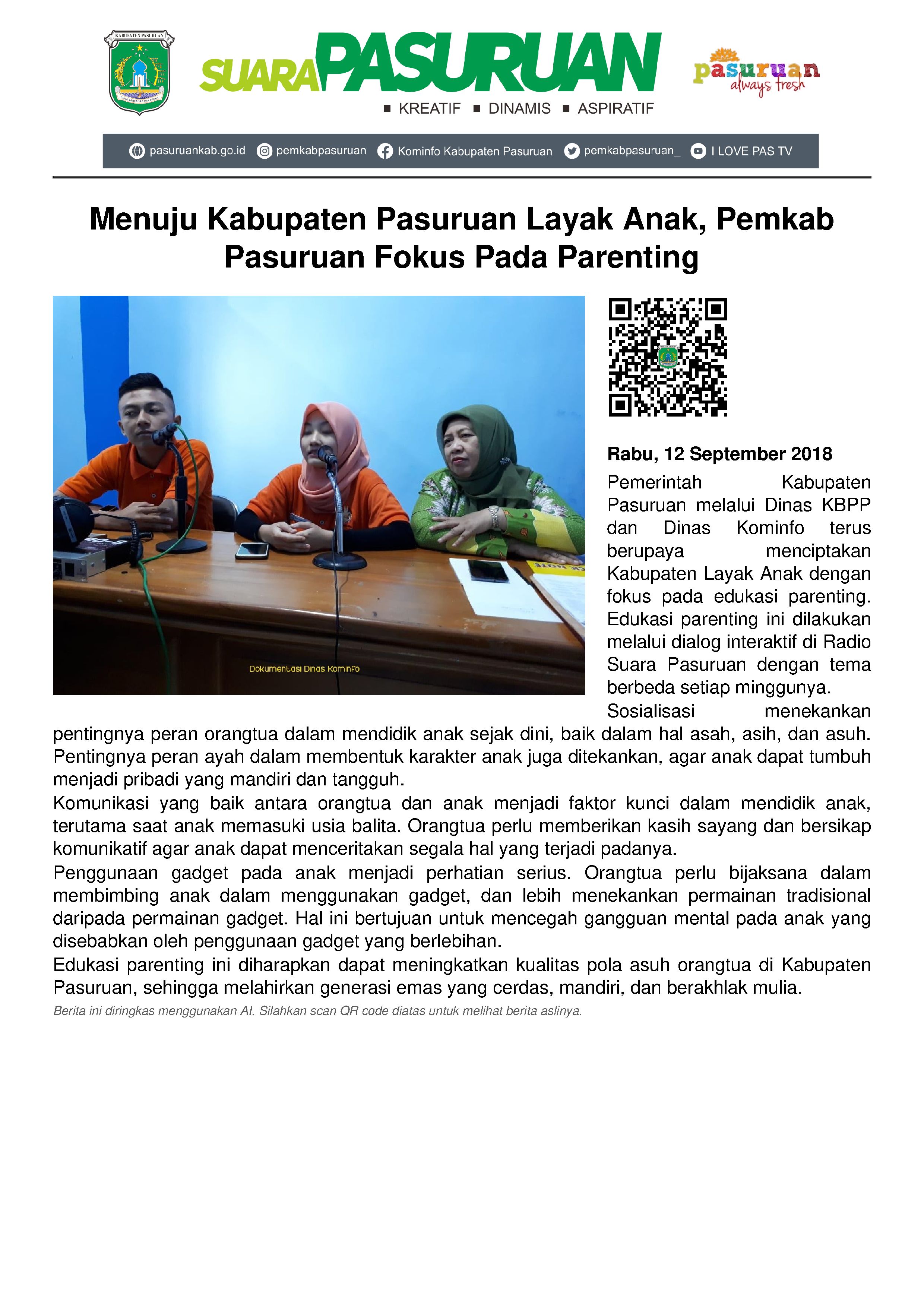 Untuk mewujudkan generasi emas, Dinas Keluarga Berencana dan Pemberdayaan Perempuan (KBPP) Kabupaten Pasuruan secara kontinyu melakukan sosialisasi kepada masyarakat tentang pentingnya pola asuh orang tua yang baik dan benar. Bersinergi dengan Dinas Kominfo Kabupaten Pasuruan, edukasi parenting yang juga ditujukan untuk menciptakan Kabupaten Layak Anak di Kabupaten Pasuruan tersebut disampaikan dalam kegiatan dialog interaktif di Lembaga Penyiaran Publik Lokal (LPPL) Radio Suara Pasuruan.