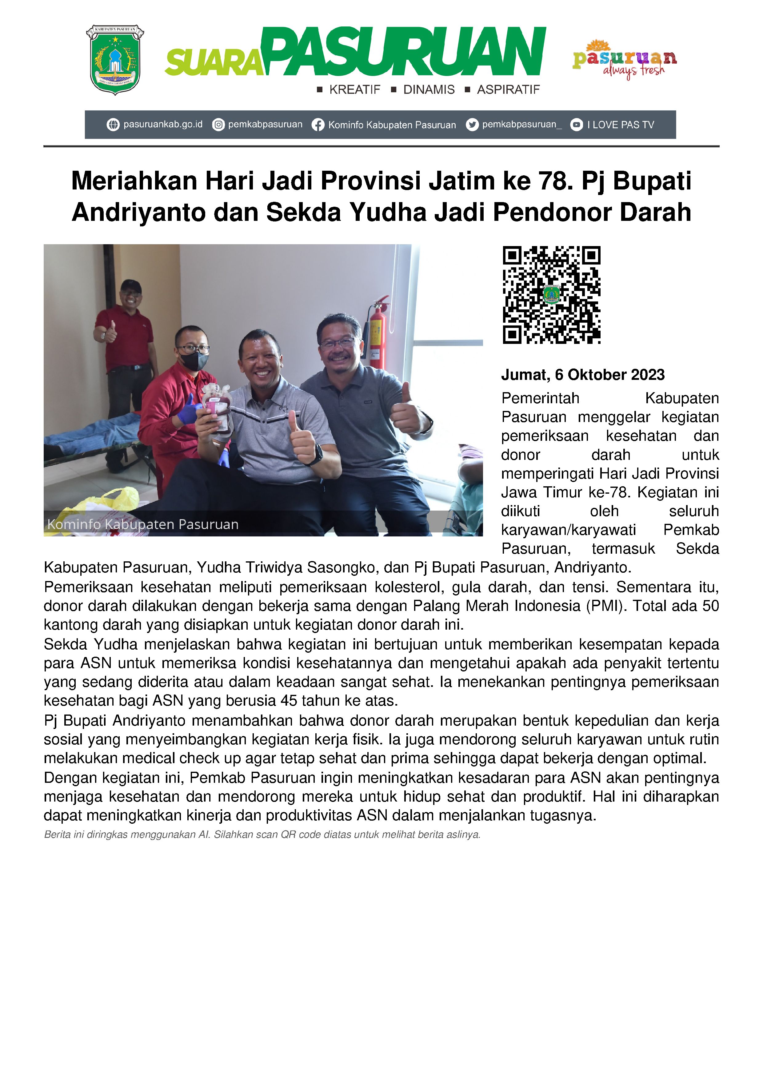 Pj Bupati Pasuruan, Andriyanto yang juga ikutan melakukan medical check up menegaskan bahwa donor darah menjadi cara Pemerintah Daerah untuk menyeimbangkan antara kerja fisik dan kerja sosial.