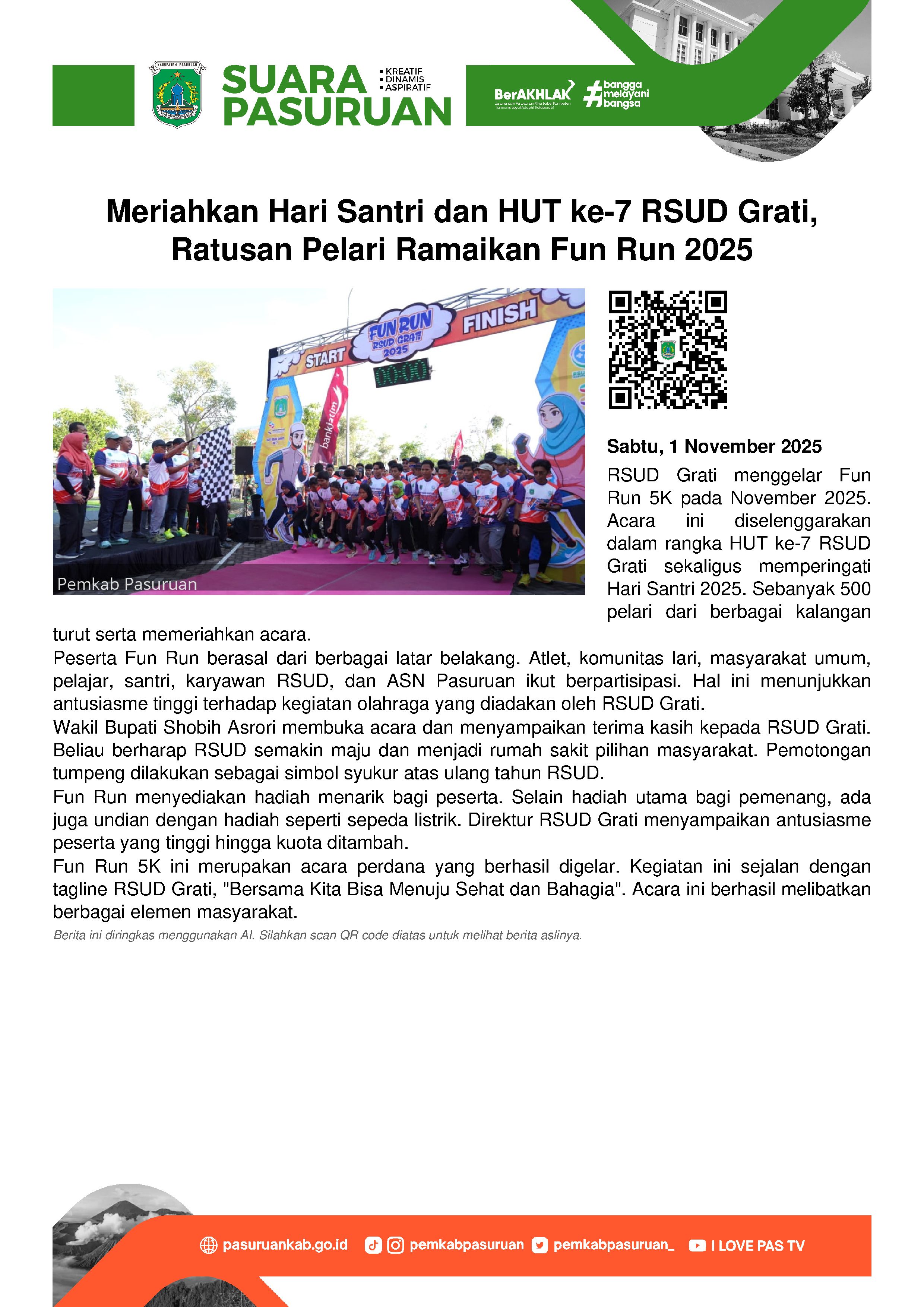 Membuka lembar baru di bulan November 2025, RSUD Grati menggelar Fun Run 5K. Sedikitnya 500 pelari meramaikan lomba lari yang khusus dihelat dalam rangka Hari Ulang Tahun ke-7 RSUD Grati sekaligus rangkaian Hari Santri 2025.