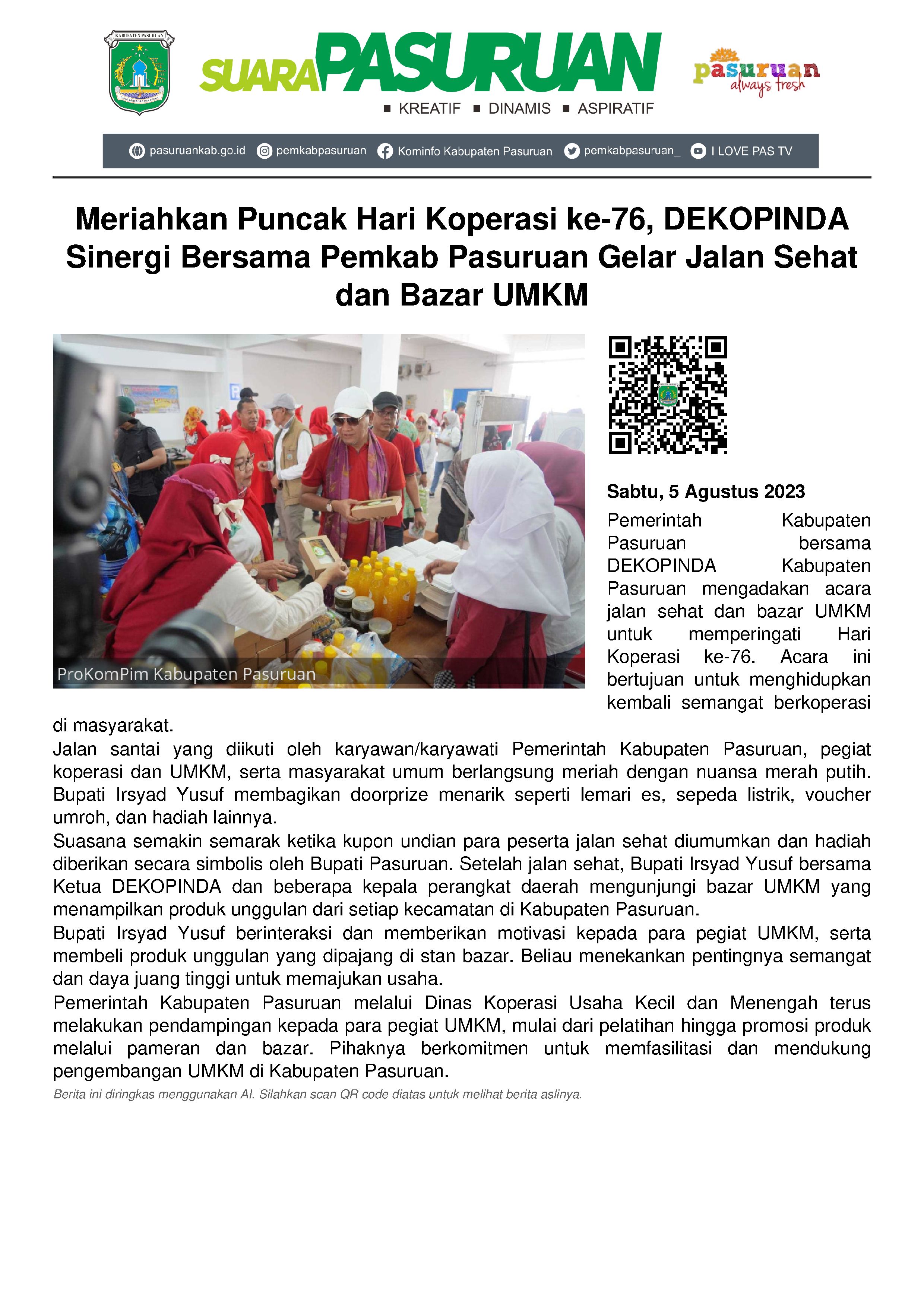 Memeriahkan Puncak Peringatan Hari Koperasi ke-76, Pemerintah Kabupaten Pasuruan bersinergi bersama Dewan Koperasi Indonesia Daerah (DEKOPINDA) Kabupaten Pasuruan dalam menggelorakan kembali semangat berkoperasi di masyarakat. Seperti halnya dalam beberapa kegiatan yang dilaksanakan pada hari ini, Sabtu (5/8/2023) pagi.