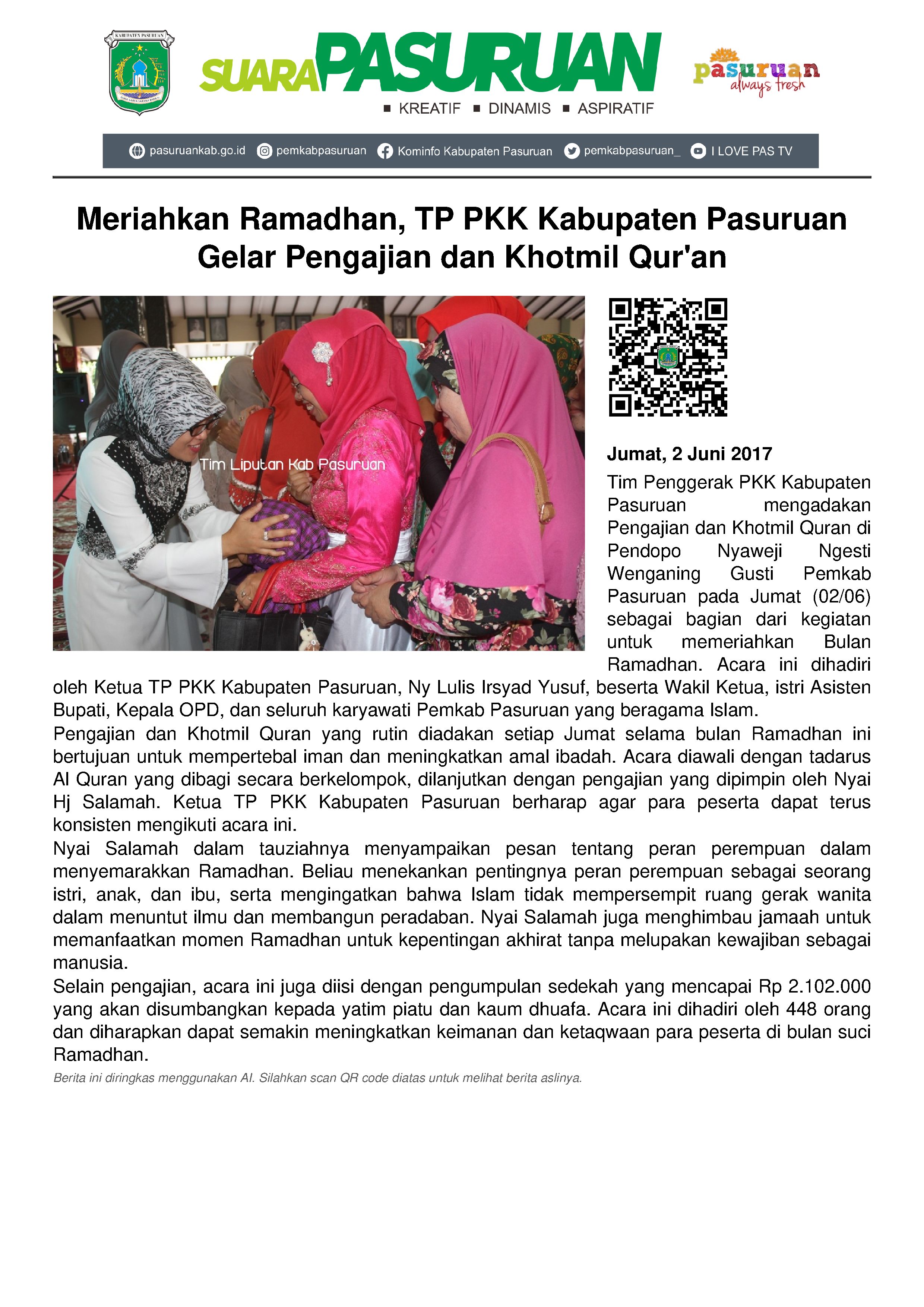 Dalam rangka memeriahkan Bulan Ramadhan, Tim Penggerak PKK Kabupaten mengelar Pengajian dan Khotmil Quran yang digelar di Pendopo Nyaweji Ngesti Wenganing Gusti Pemkab Pasuruan, Jumat (02/06).