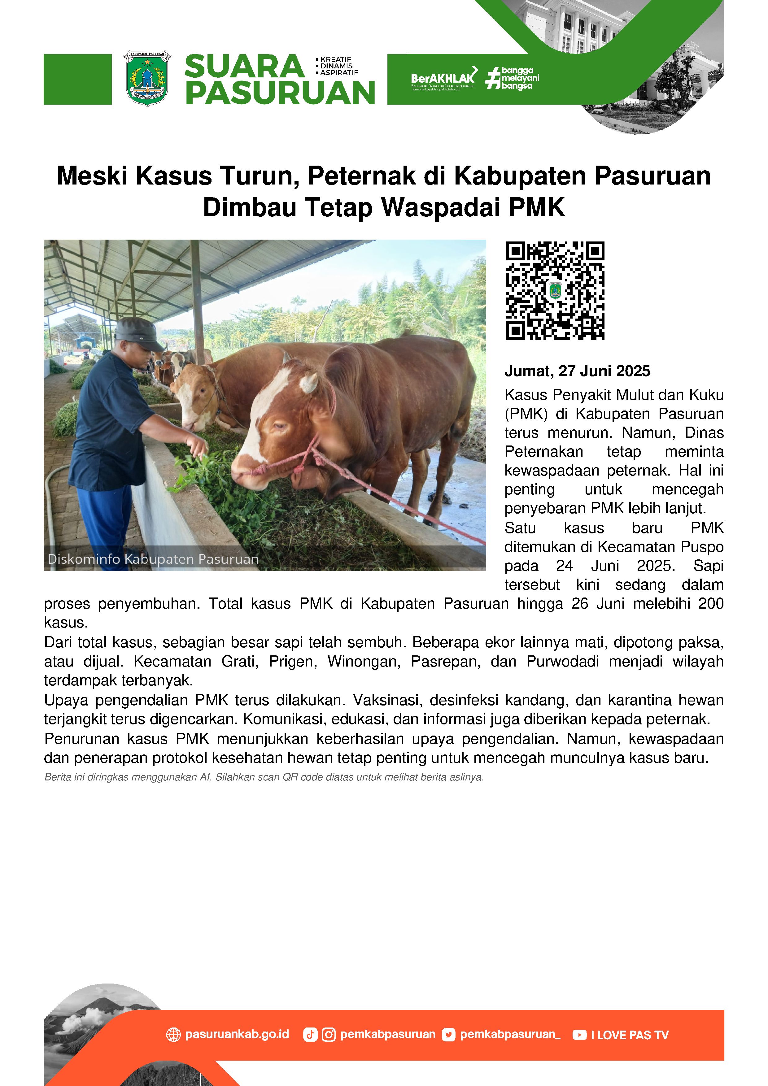 Dari data terbaru Disnakkeswan Kabupaten Pasuruan, per 26 Juni 2025 kemarin, jumlah kasus PMK di Kabupaten Pasuruan tercatat lebih dari 200 kasus.