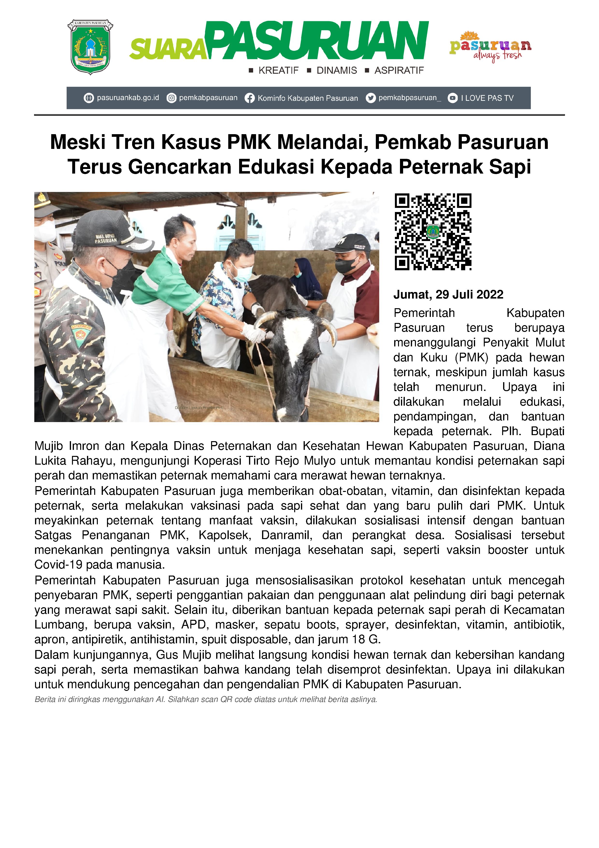 Sekalipun saat ini jumlah hewan ternak Sapi yang terjangkit Penyakit Mulut dan Kuku (PMK) sudah berangsur turun, Pemerintah Kabupaten Pasuruan terus gencar melakukan upaya penanggulangan. Mulai dari memberikan edukasi, pendampingan hingga memberikan bantuan bagi peternak.