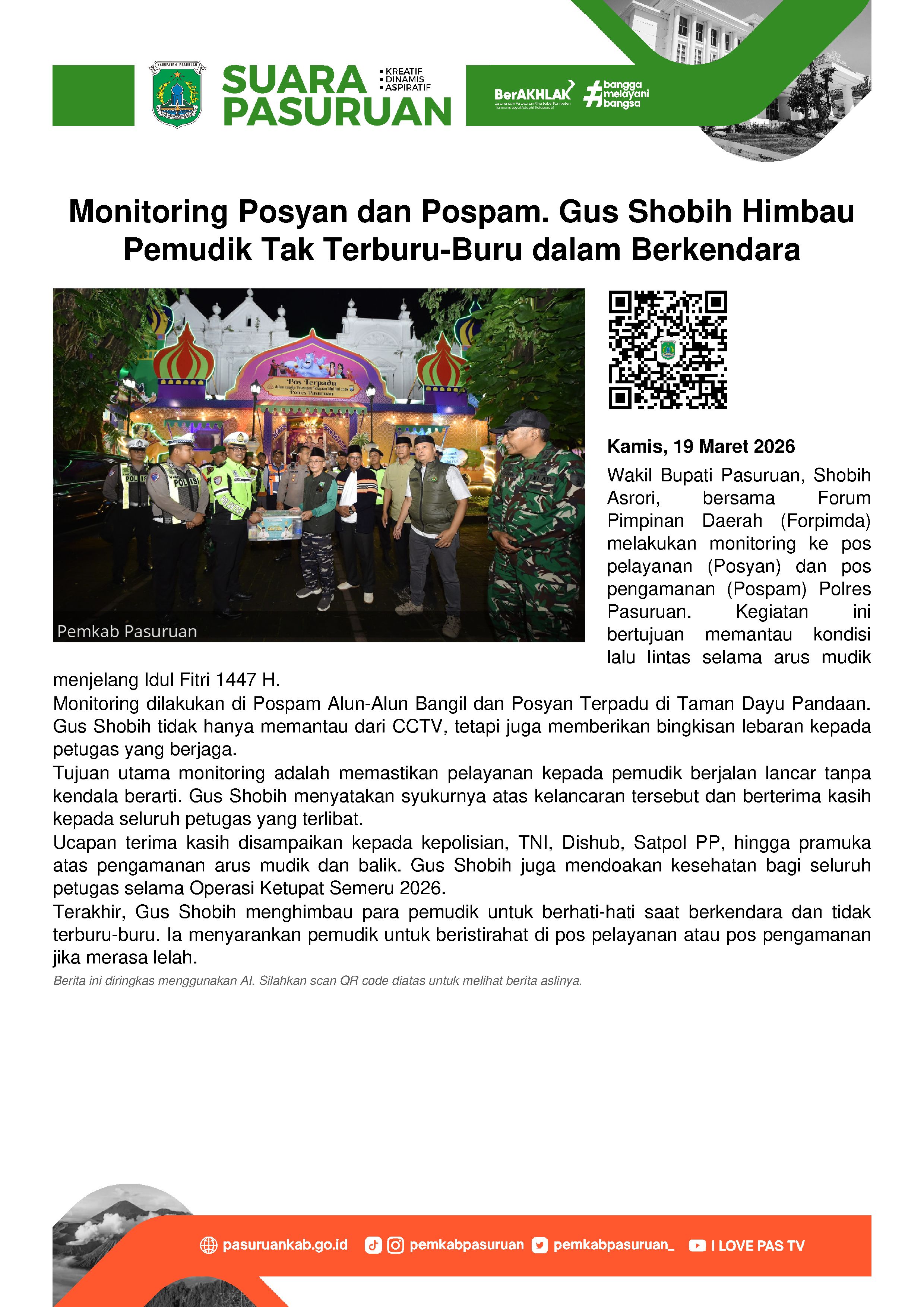 Wakil Bupati Pasuruan, Shobih Asrori bersama Forpimda Kabupaten Pasuruan melaksanakan monitoring ke sejumlah pos pelayanan (Posyan) dan pos pengamanan (pospam) yang dibangun Polres Pasuruan, Kamis (19/3/2026) malam.