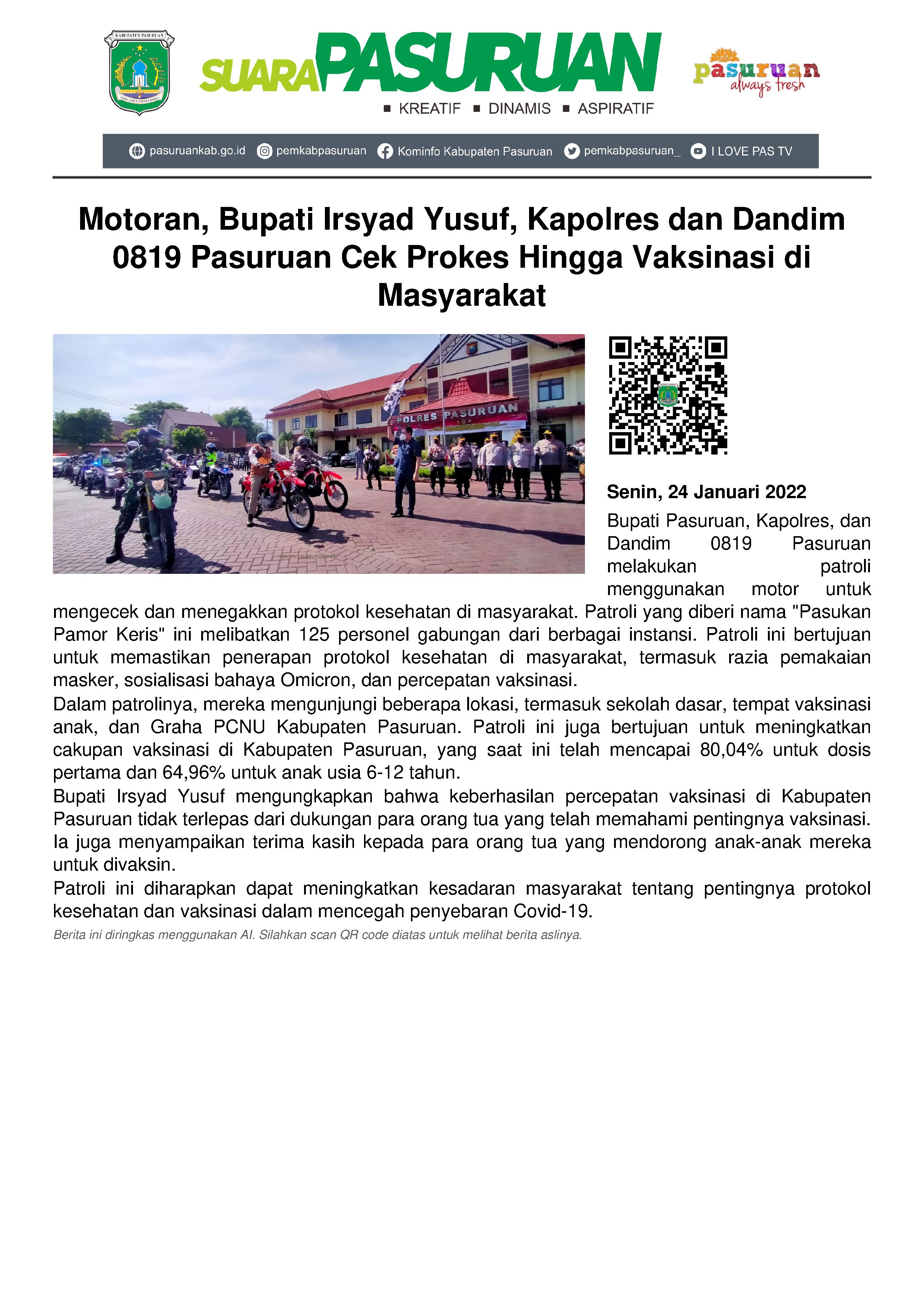 Perihal vaksinasi di Kabupaten Pasuruan, cakupannya kini sudah mencapai 80,04% atau sebanyak 993.071 warga Kabupaten Pasuruan yang sudah divaksin dosis pertama.