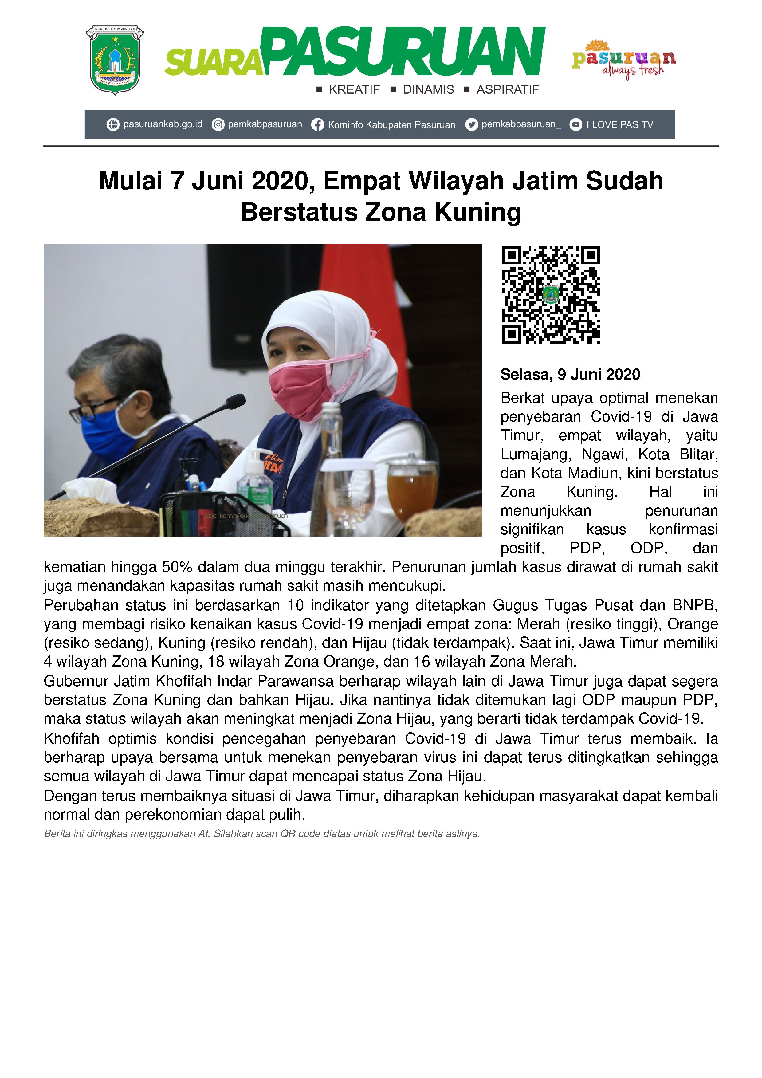 Berkat pengoptimalan upaya penekanan penyebaran Covid-19 di Jawa Timur, ada beberapa daerah yang berubah status. Terhitung mulai hari Minggu (7/6/2020) malam, tercatat empat Kabupaten/Kota yaitu Lumajang, Ngawi, Kota Blitar dan Kota Madiun telah berstatus Zona Kuning dari sebelumnya Zona Merah.