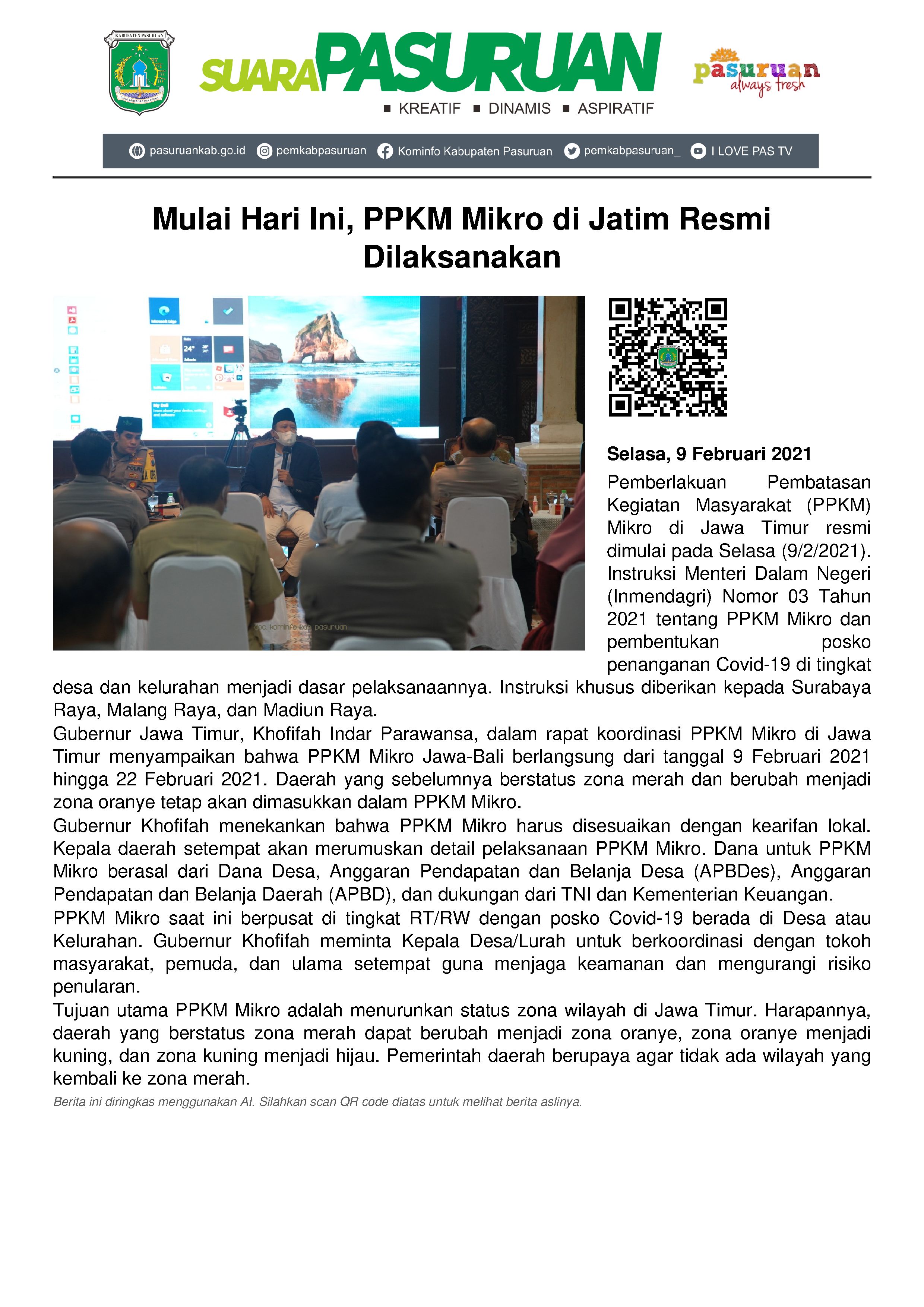 Gubernur Jawa Timur, Khofifah Indar Parawansa dalam video conference Rapat Koordinasi PPKM Mikro di Jawa Timur tadi malam (8/2/2021) menyampaikan bahwa PPKM Mikro Jawa-Bali dimulai tanggal 9 Februari 2021 sampai dengan 22 Februari 2021. Khusus daerah yang sebelumnya menjadi zona merah dan kemudian berganti menjadi zona oranye tetap akan dimasukkan ke dalam PPKM.