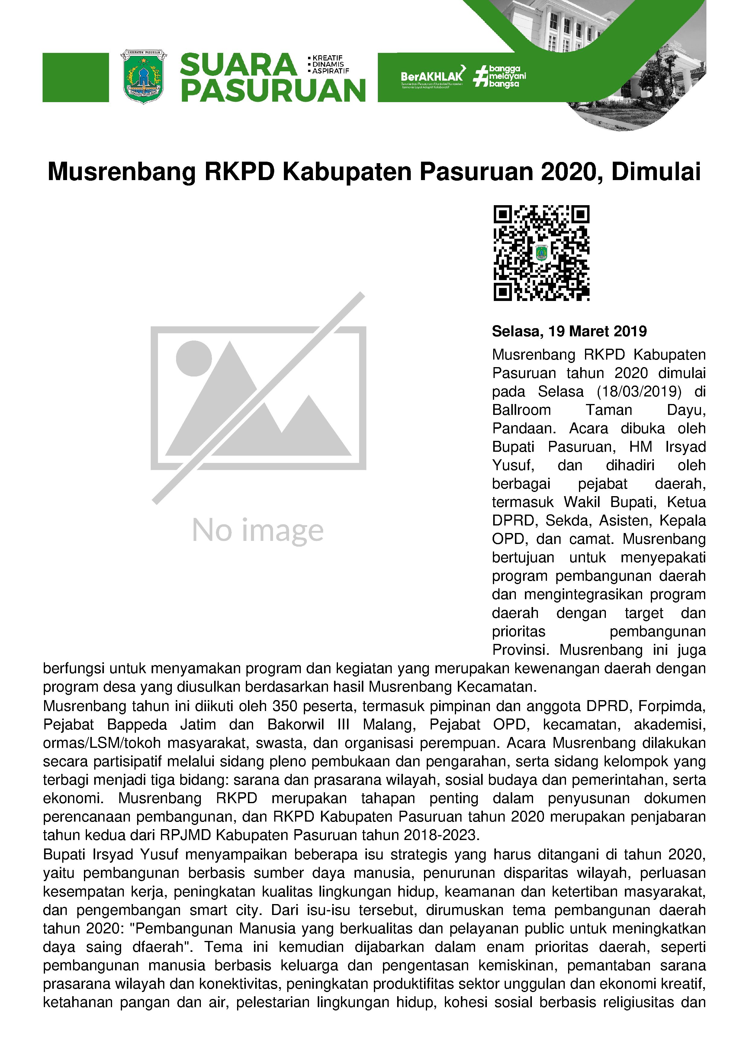 Musrenbang (Musyawarah Perencanaan Pembangunan) RKPD Kabupaten Pasuruan tahun 2020, dimulai.