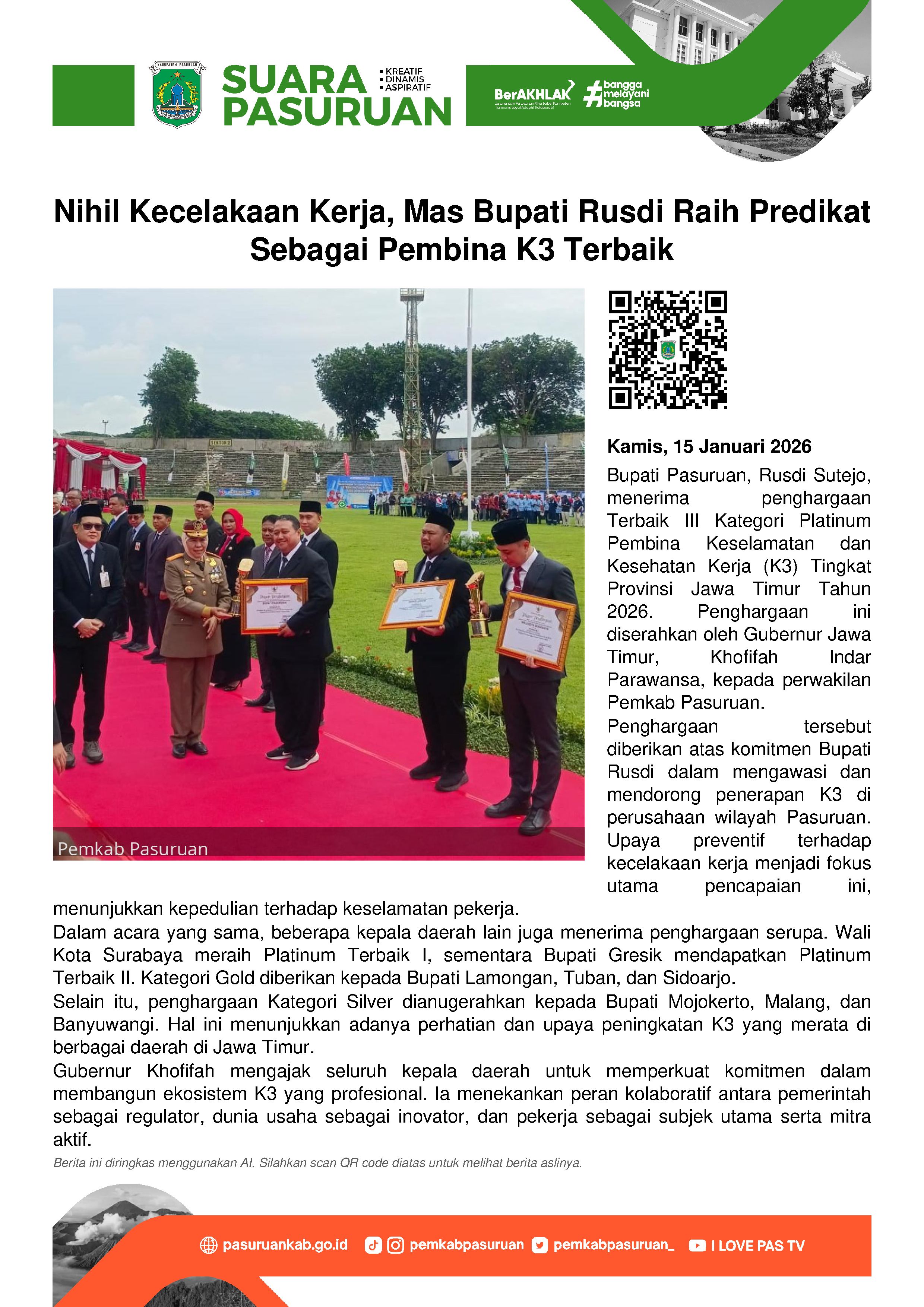Capaian prestisius yang diberikan pada saat Apel Peringatan Bulan K3 Nasional Tahun 2026 di Lapangan PT Petrokimia Gresik tersebut disematkan berkat komitmen Bupati. Khususnya dalam mengawasi dan mendorong penerapan K3 di berbagai perusahaan di wilayah Pasuruan sebagai upaya preventif kecelakaan kerja.