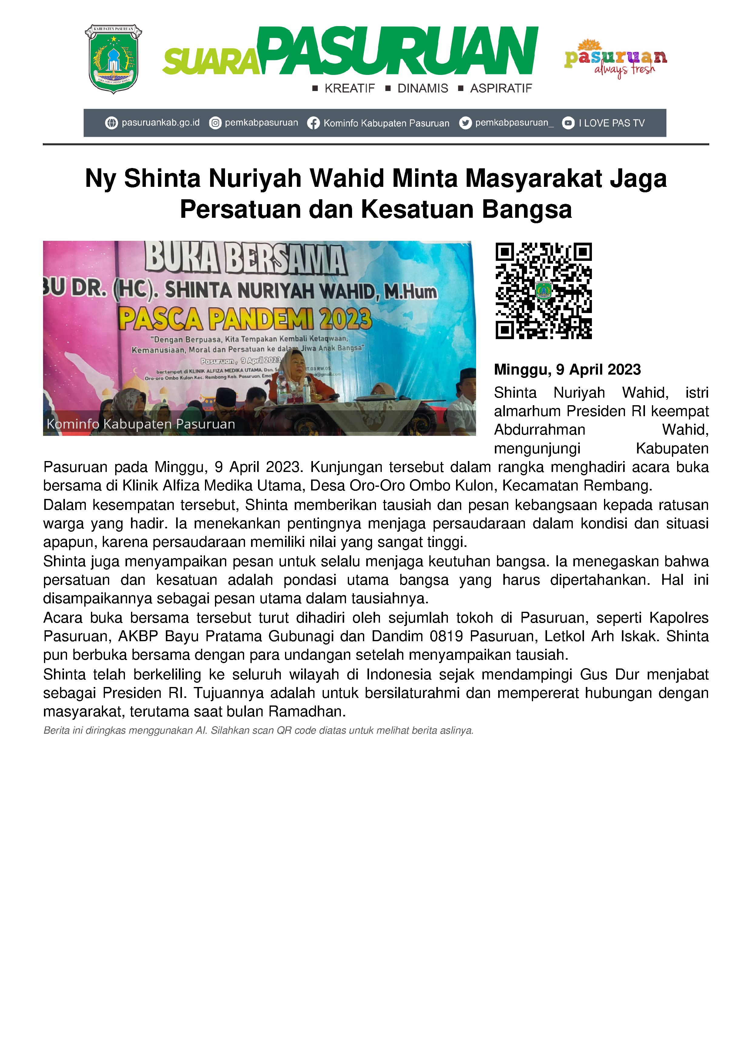 Tak banyak yang disampaikannya. Dalam tausiahnya, Shinta mengajak masyarakat untuk tetap menjaga persaudaraan dalam kondisi dan situasi apapun.